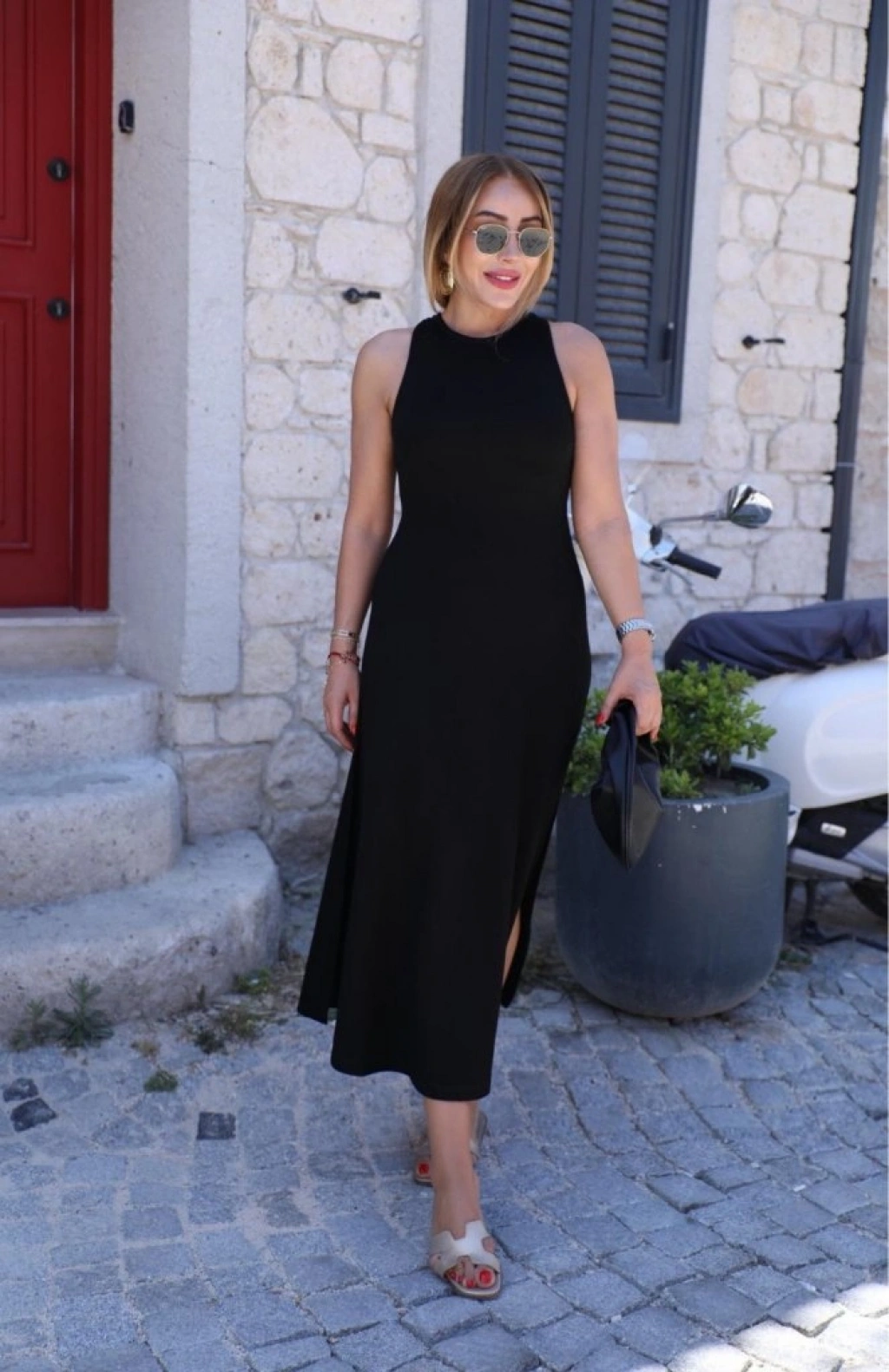 Kadın Omuzlardan Açık Arkadan Aksesuar Detaylı Yırtmaçlı Janjan Krep Elbise