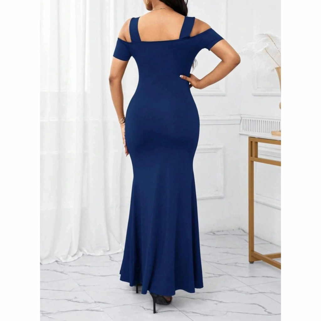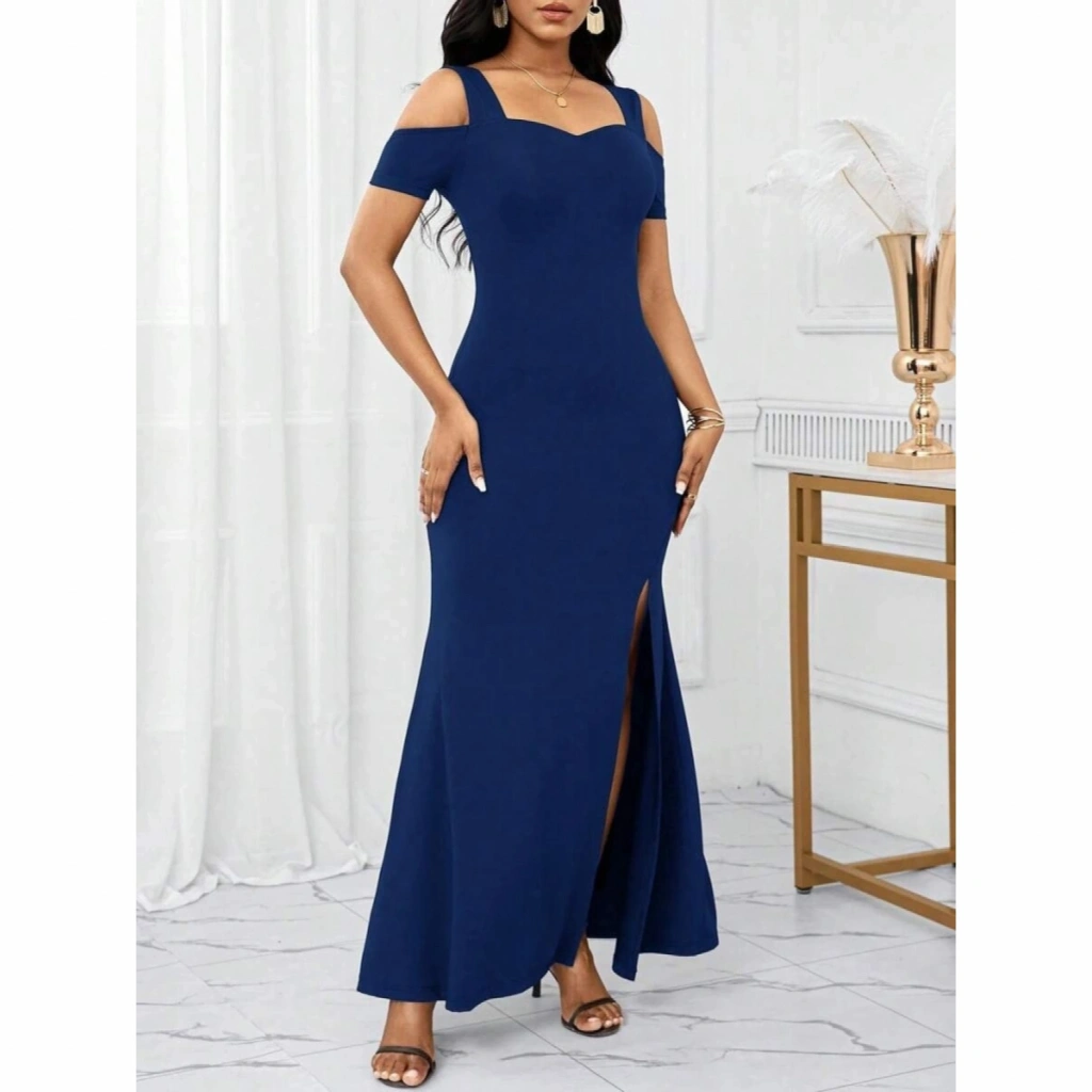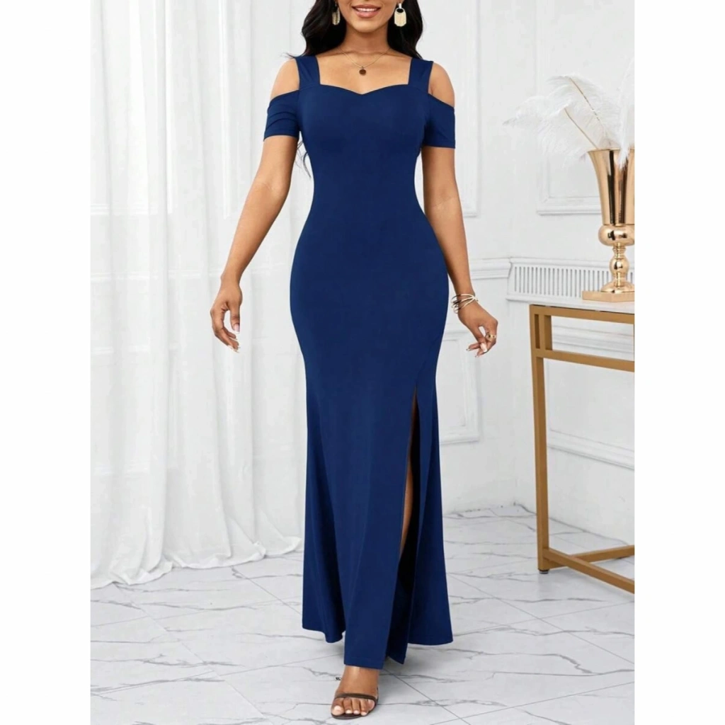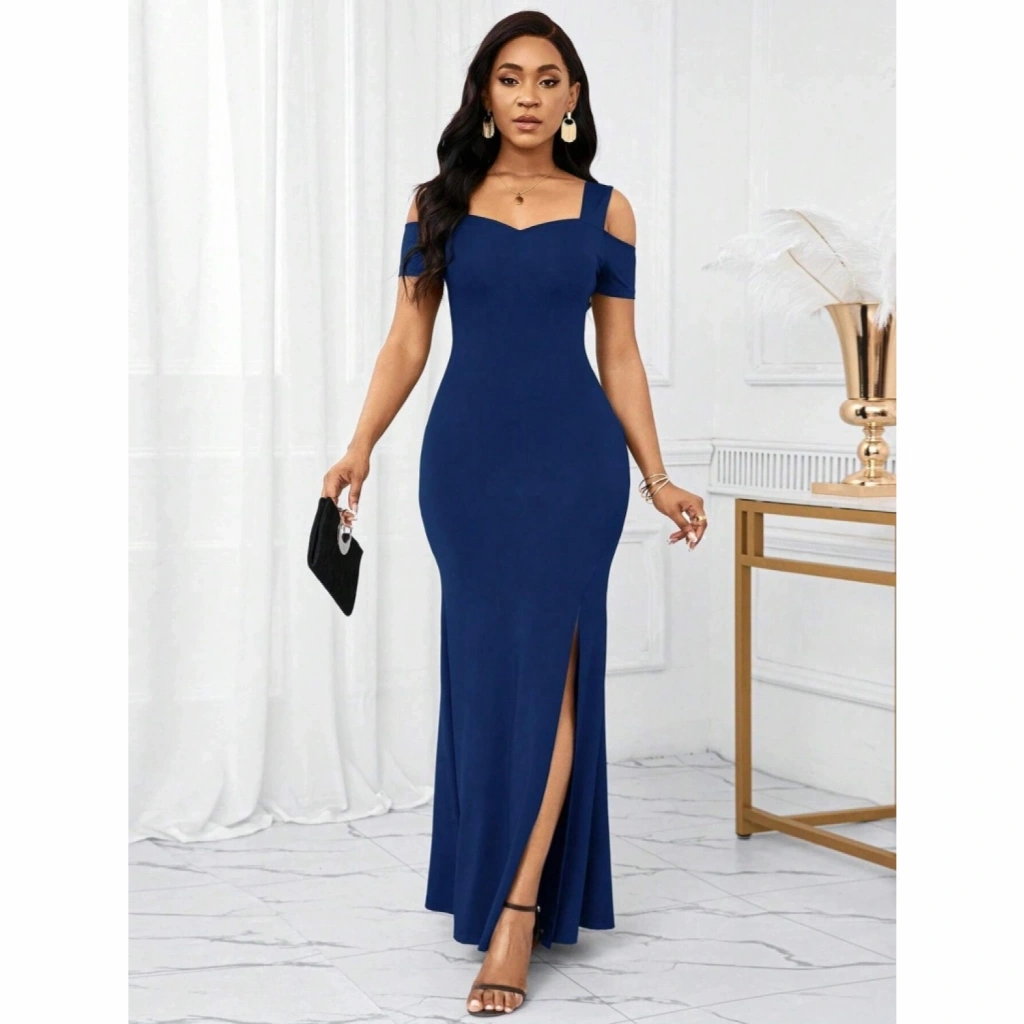 Kadın Omuzlardan Açık Askılı Yırtmaç Detaylı Uzun Ithal Krep Elbise
