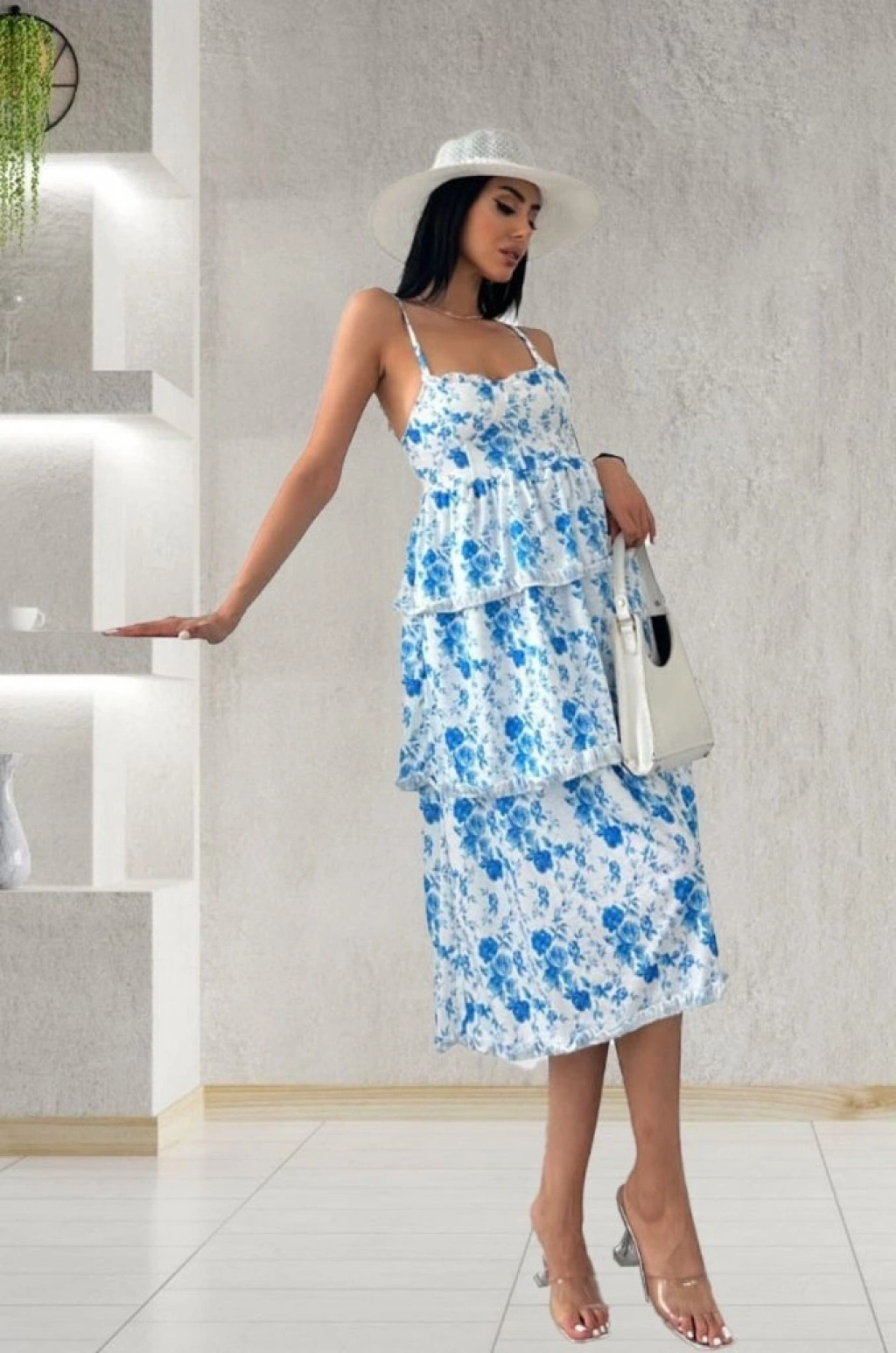 Kadın Sıfır Kol Askılı Dekolteli Yırtmaç Detay çiçek Baskılı Süprem Midi Elbise