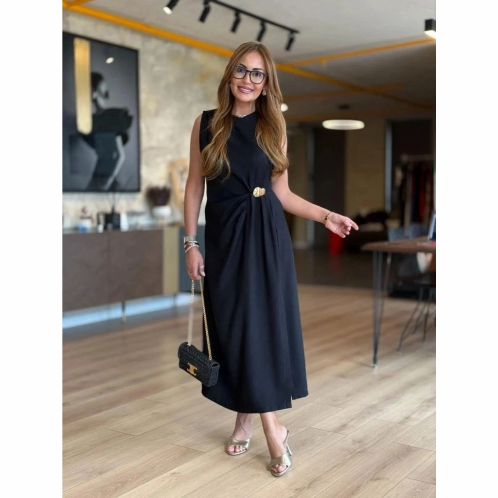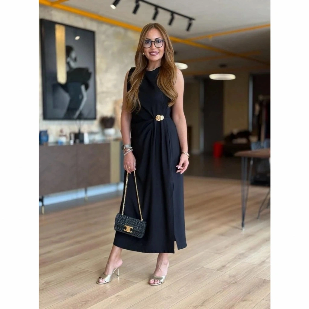 Kadın Sıfır Kollu Bisiklet Yaka Belden Büzgülü Yırtmaç Detaylı Janjan Krep Elbise