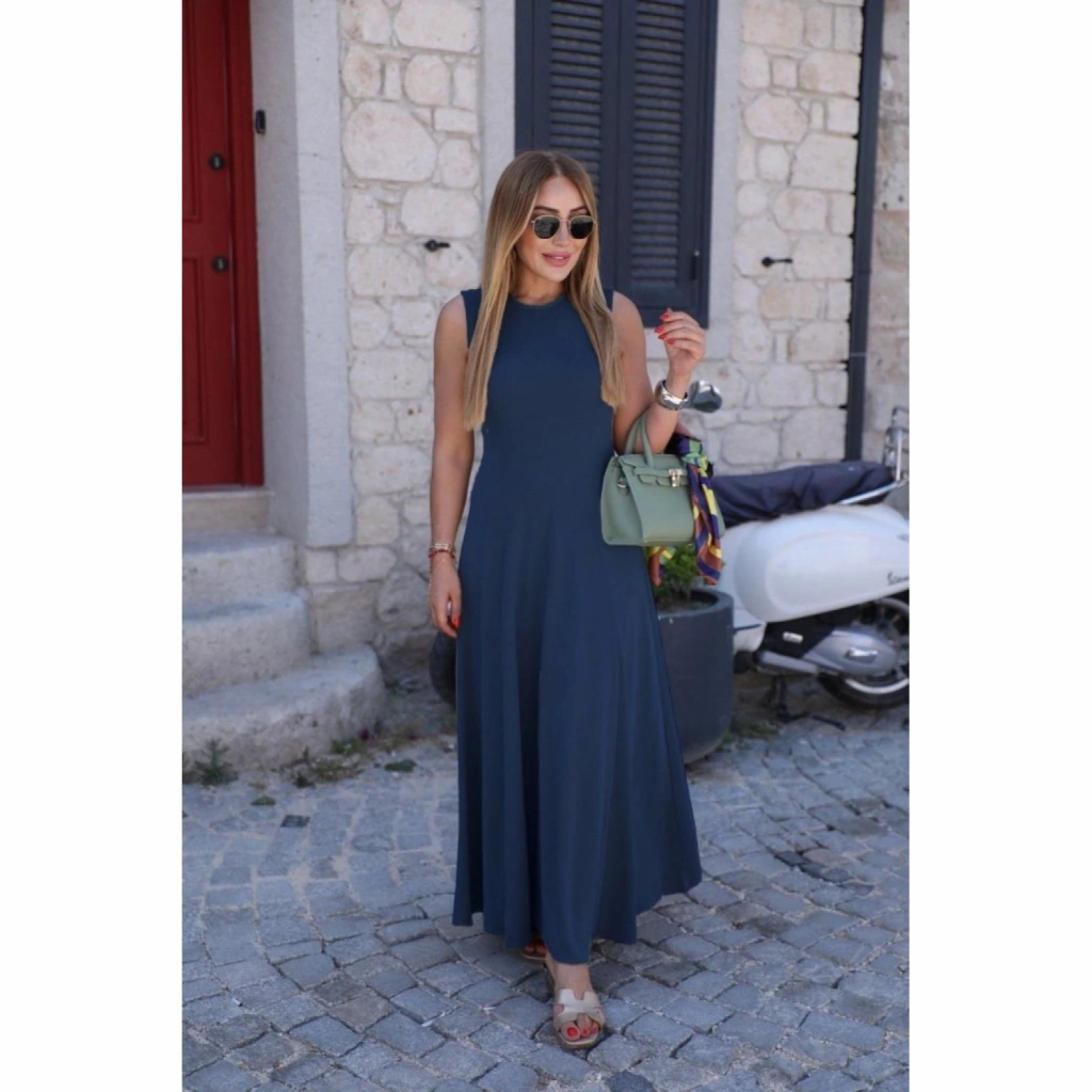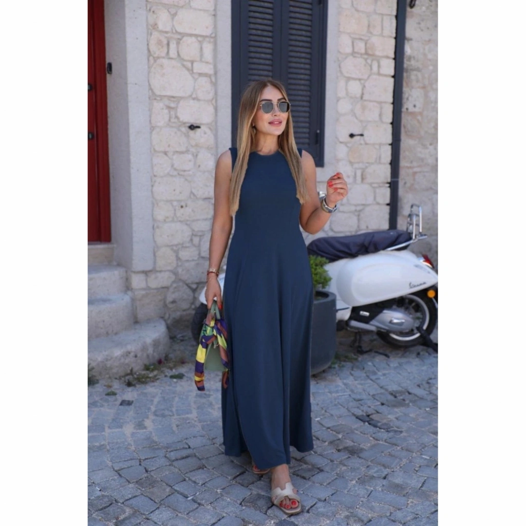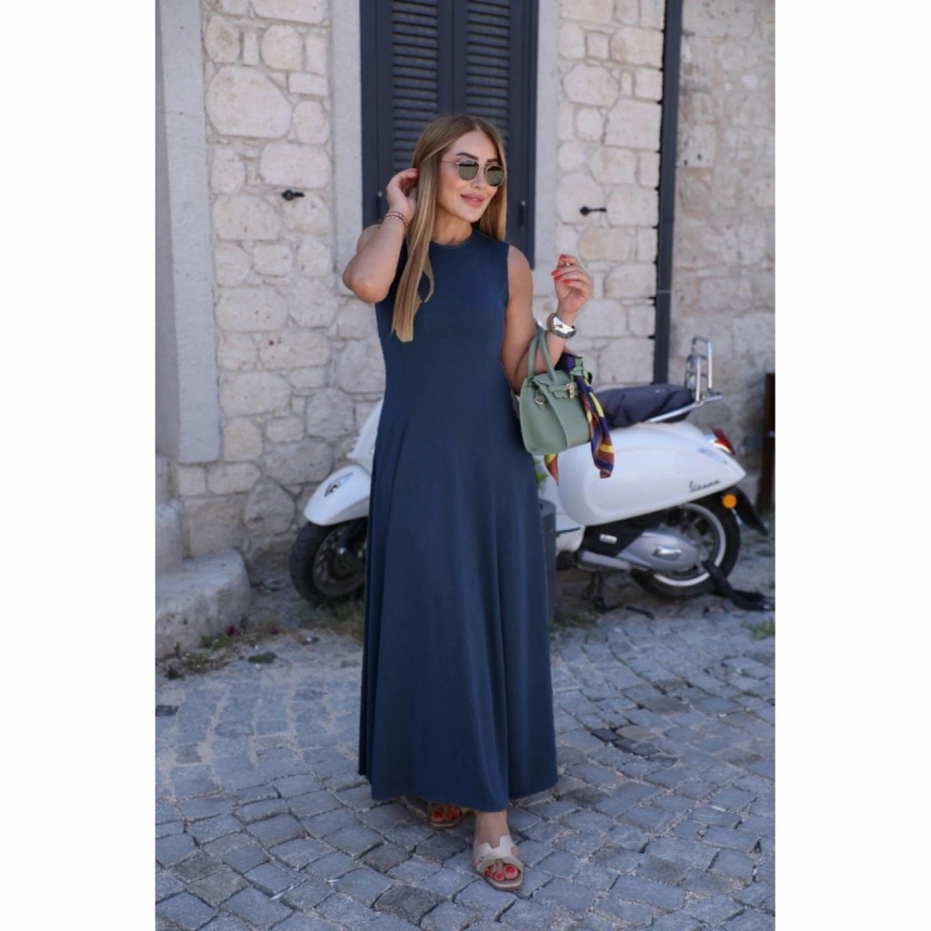 Kadın Sıfır Kollu Bisiklet Yaka Viskon Elbise