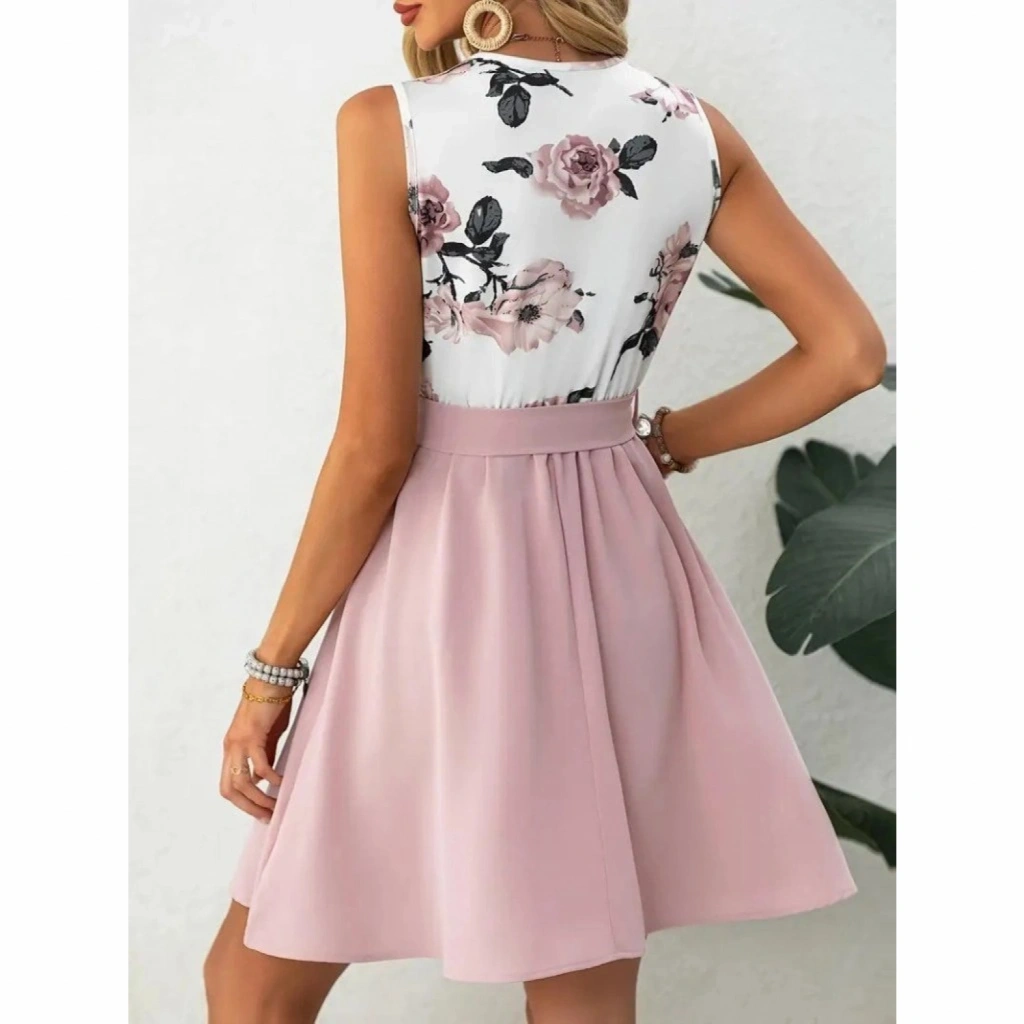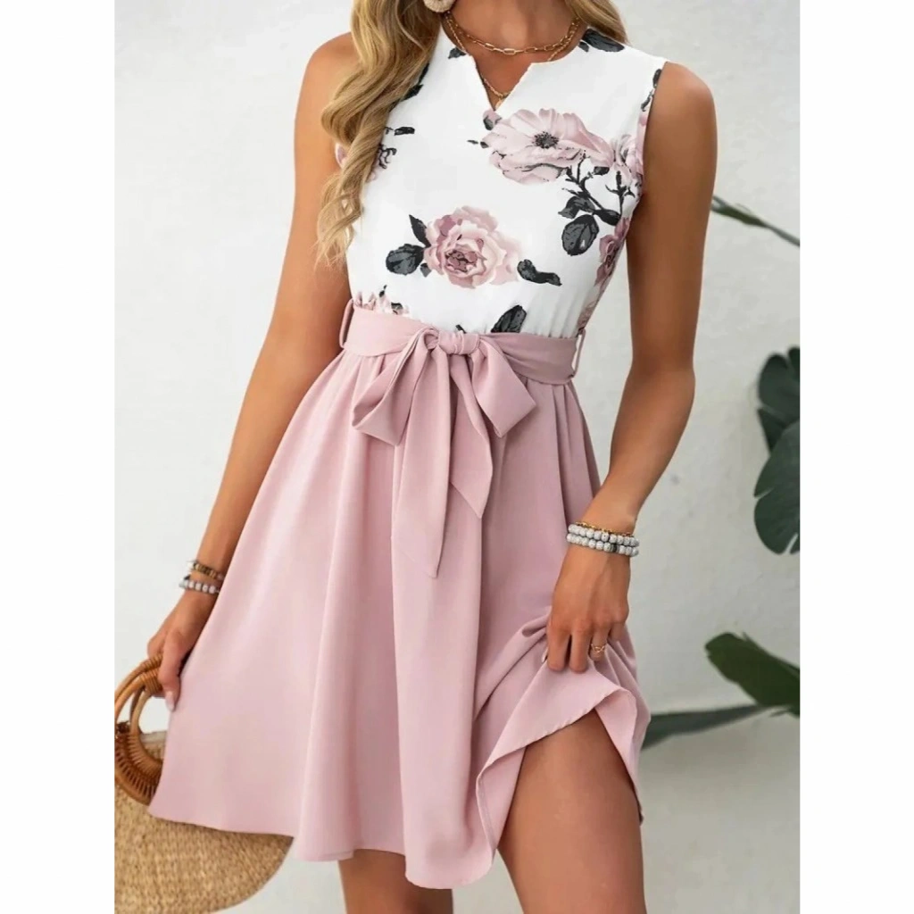 Kadın Sıfır Kollu V Yakalı çiçek Baskılı Beli Kuşaklı Dalgıç Elbise