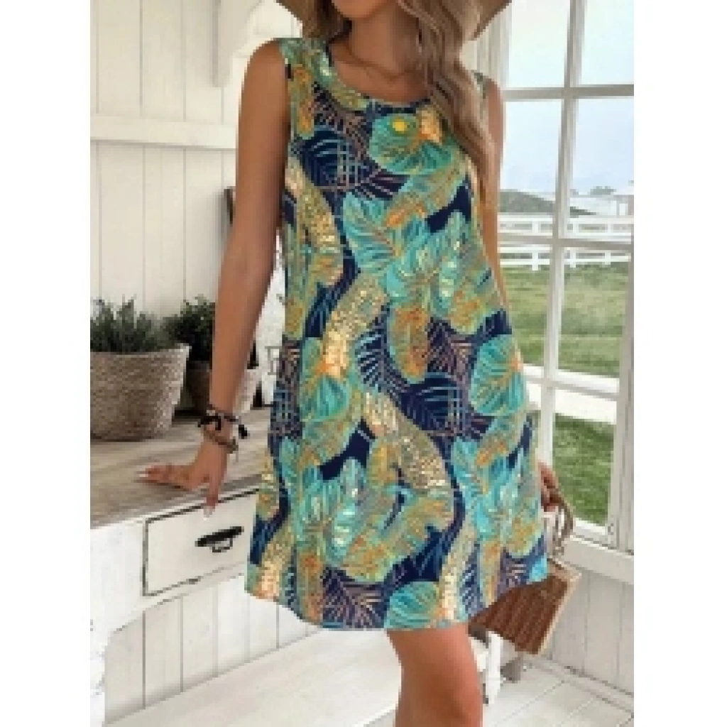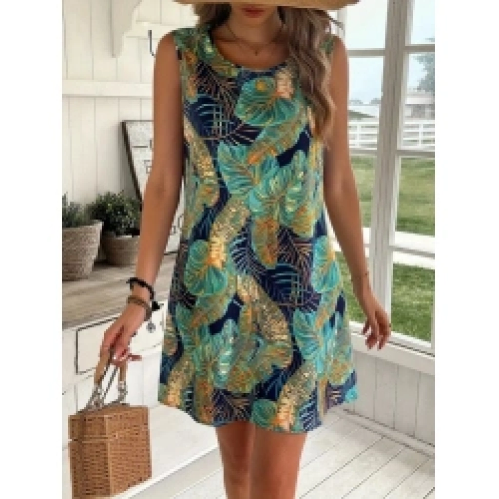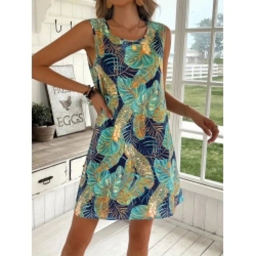 Kadın Sıfır Kollu Yuvarlak Yaka Desenli Süprem Elbise