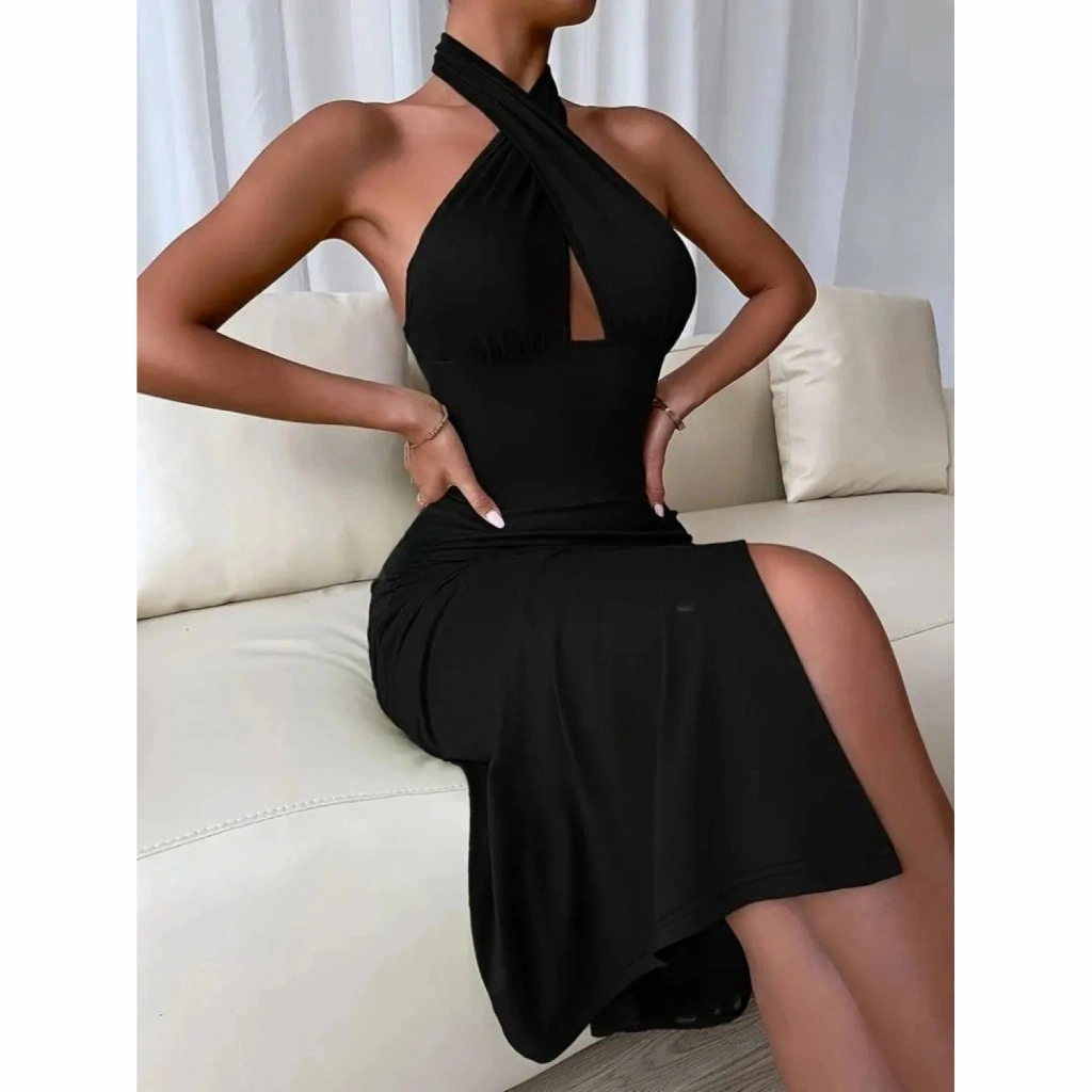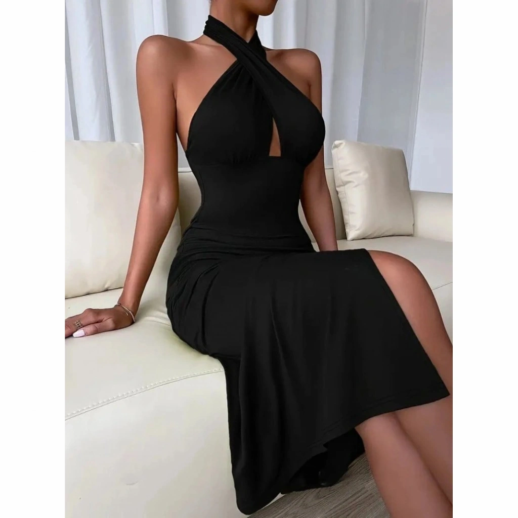 Kadın Sırt Dekolteli Boyun çapraz Yakalı Yırtmaç Detay Midi Sandy Elbise