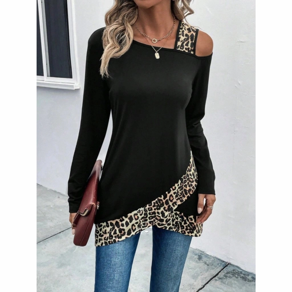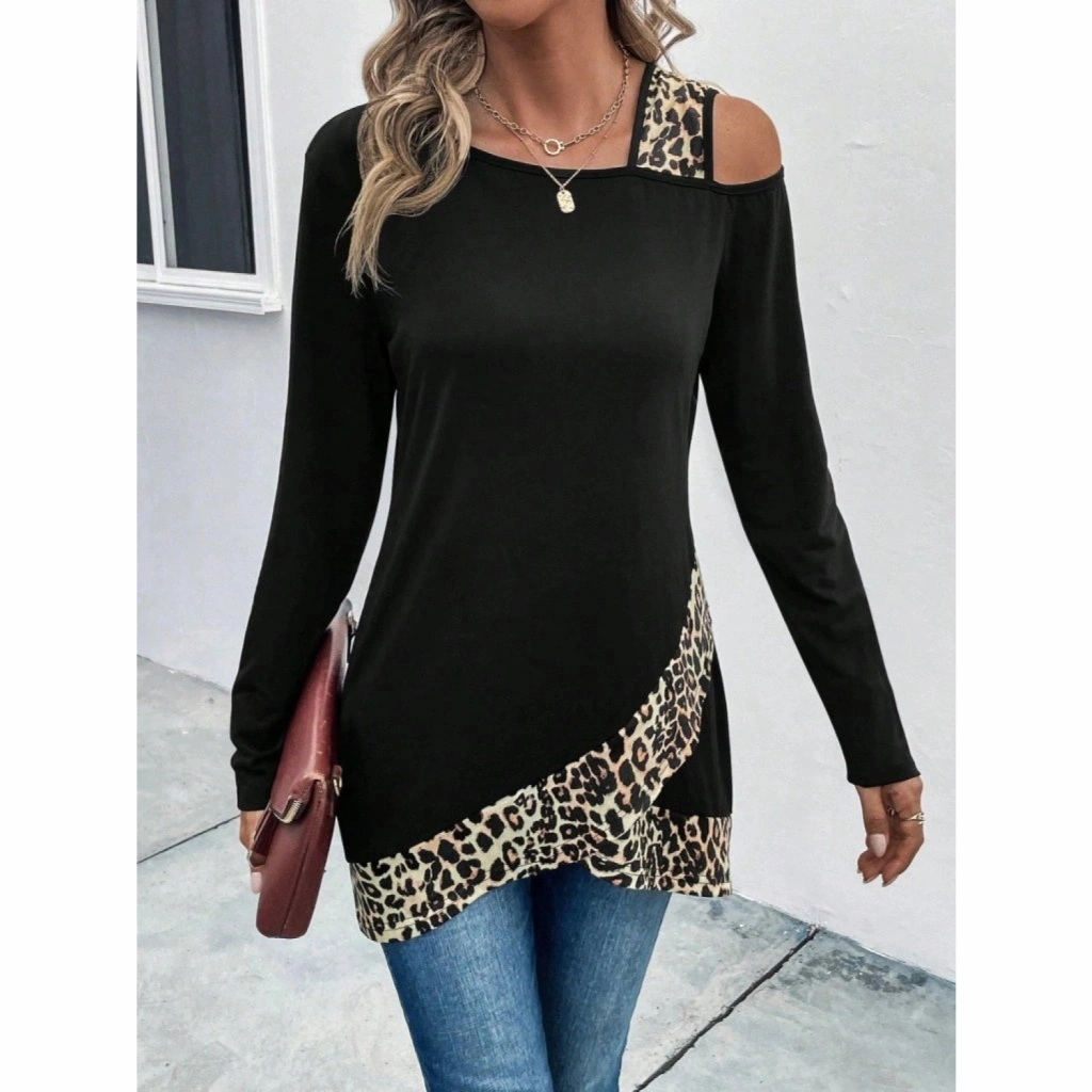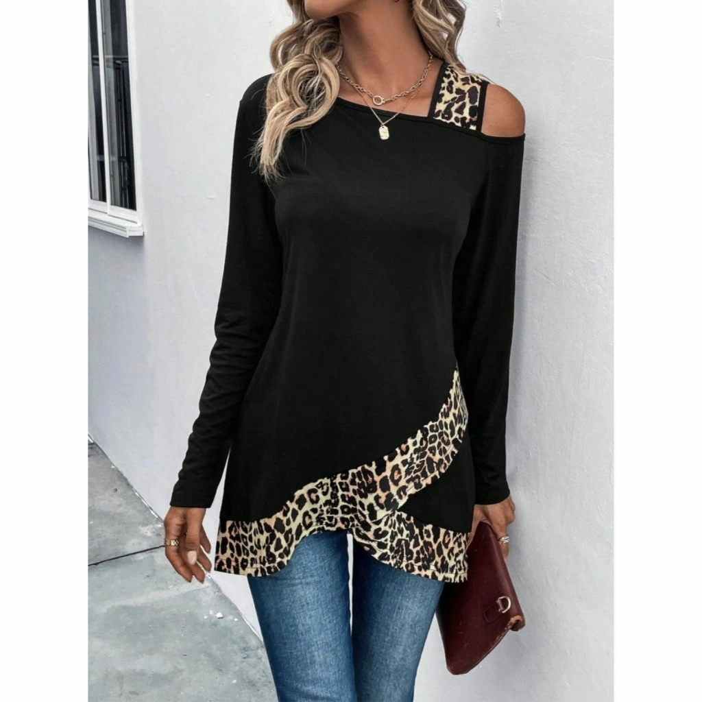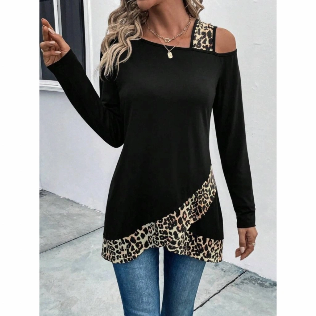 Kadın Tek O Uzdan Açık Askılı Uzun Kollu Leopar Detaylı Viskon Bluz