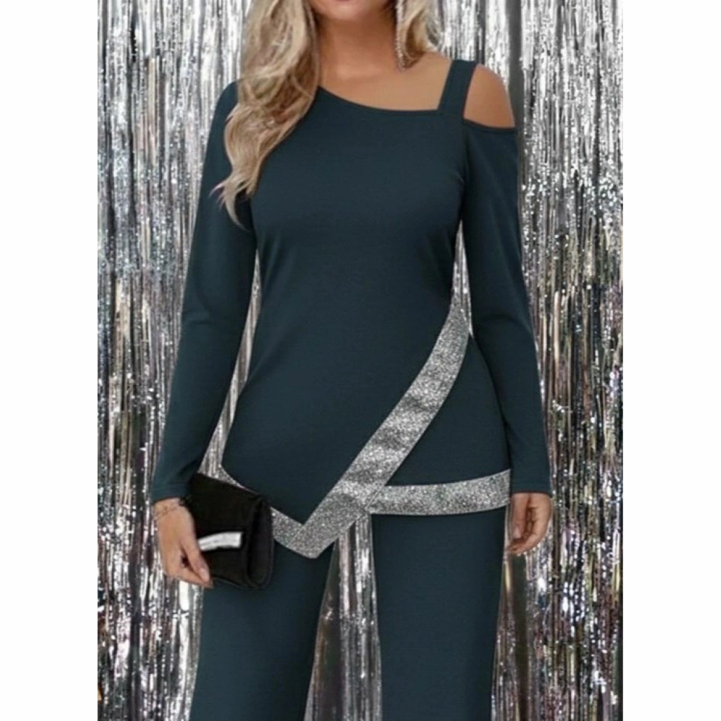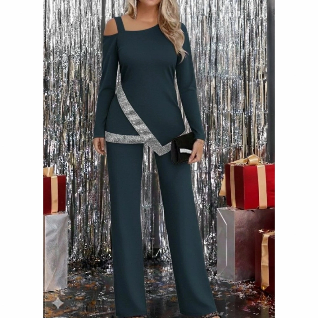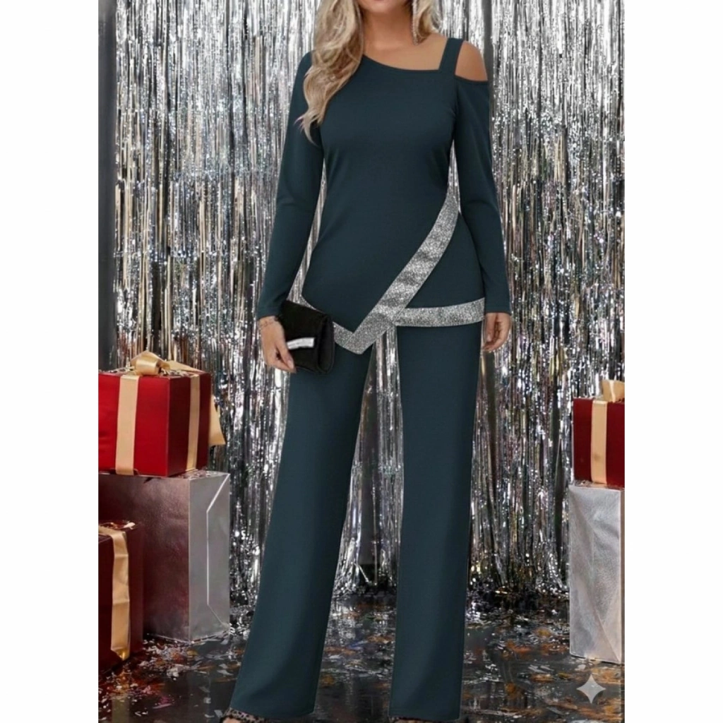 Kadın Tek Omuzdan Açık Uzun Kollu önü Pulpayet Ithal Krep Bluz Ve Pantolon