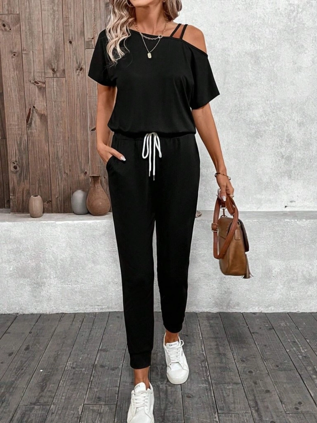 Kadın Tek Omuzdan Açık Viskon Iki Iplik Bluz Bağcıklı Pantolon Ikili Takım
