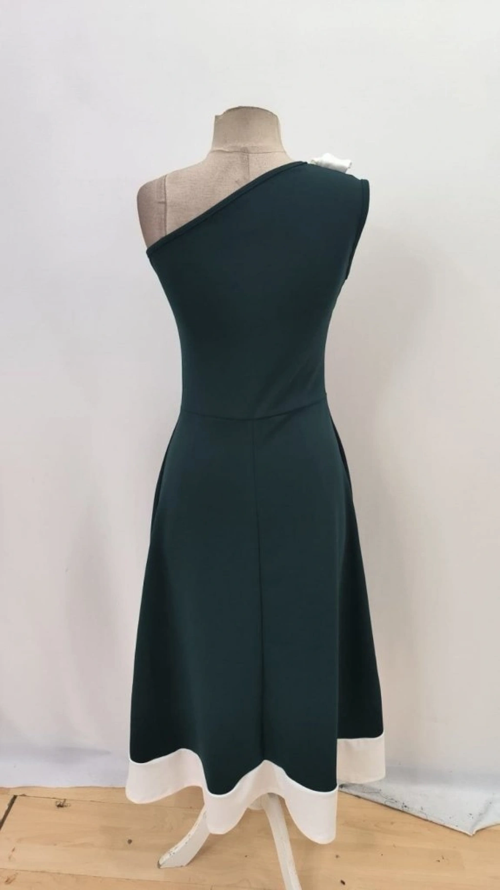 Kadın Tek Omuzu Açık Omuzlardan Kurdela Detaylı çift Renkli Ithal Krep Elbise