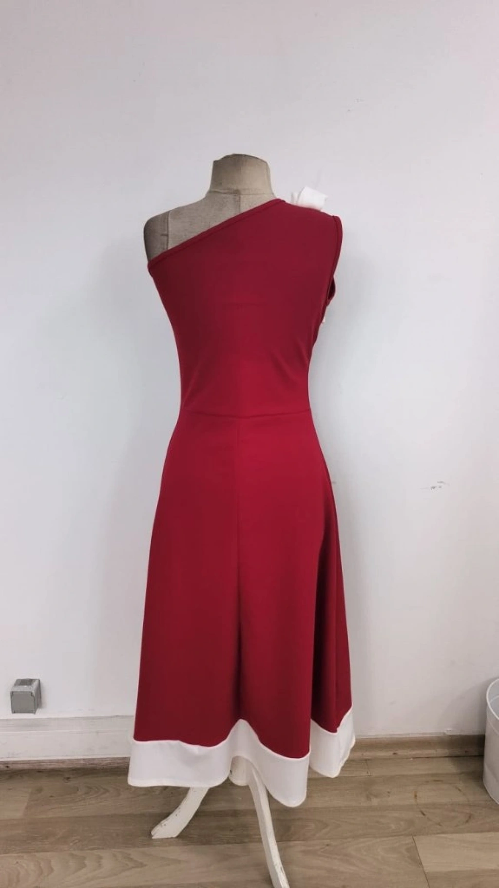 Kadın Tek Omuzu Açık Omuzlardan Kurdela Detaylı çift Renkli Ithal Krep Elbise