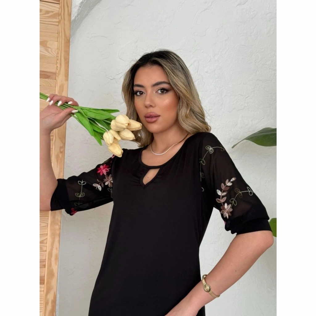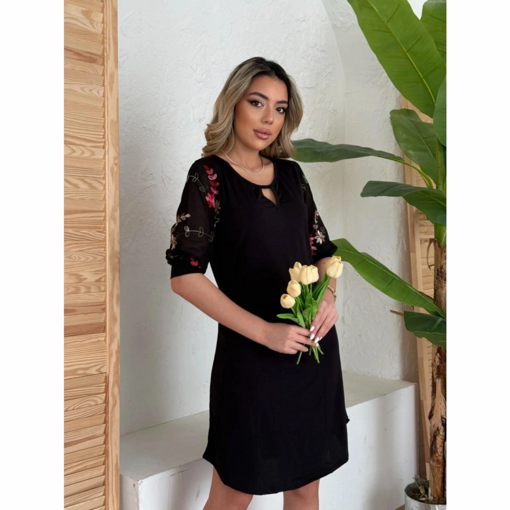 Kadın Truvakar Kol çiçek Desenli Tül Kol Bisiklet Yaka çiçek Desen Sandy Salaş Kısa Elbise