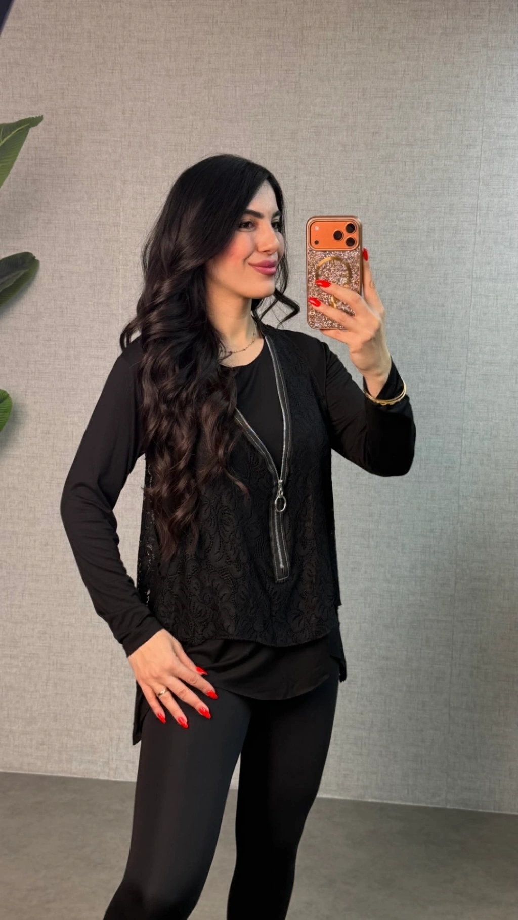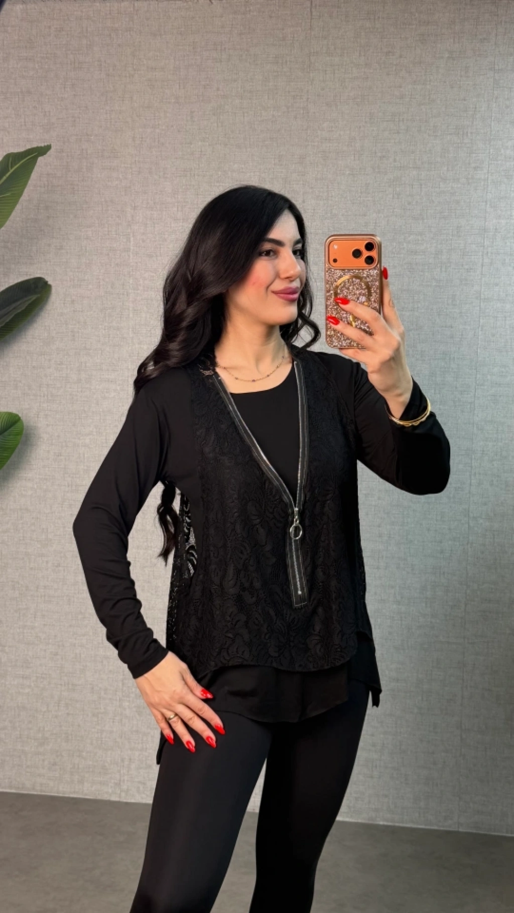 Kadın Uzun Kollu Asimetrik Kesim Bluz Ve Dantel Güpür Transparan Detay Fermuarlı Yelek Ikili Takım