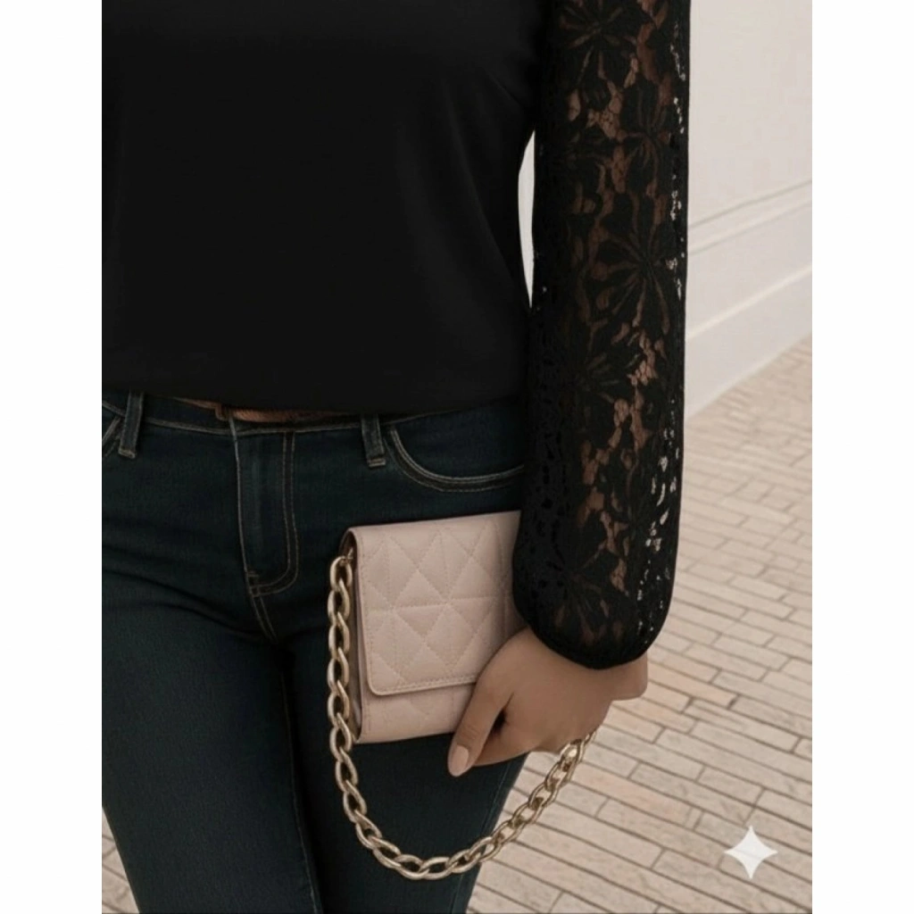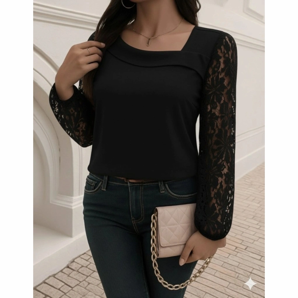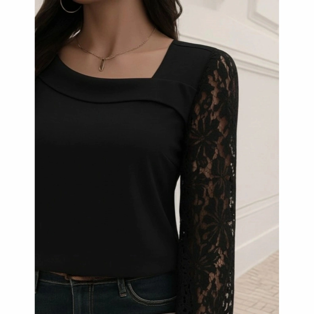 Kadın Uzun Kollu Asimetrik Yakalı Dantelli Ithal Krep Bluz