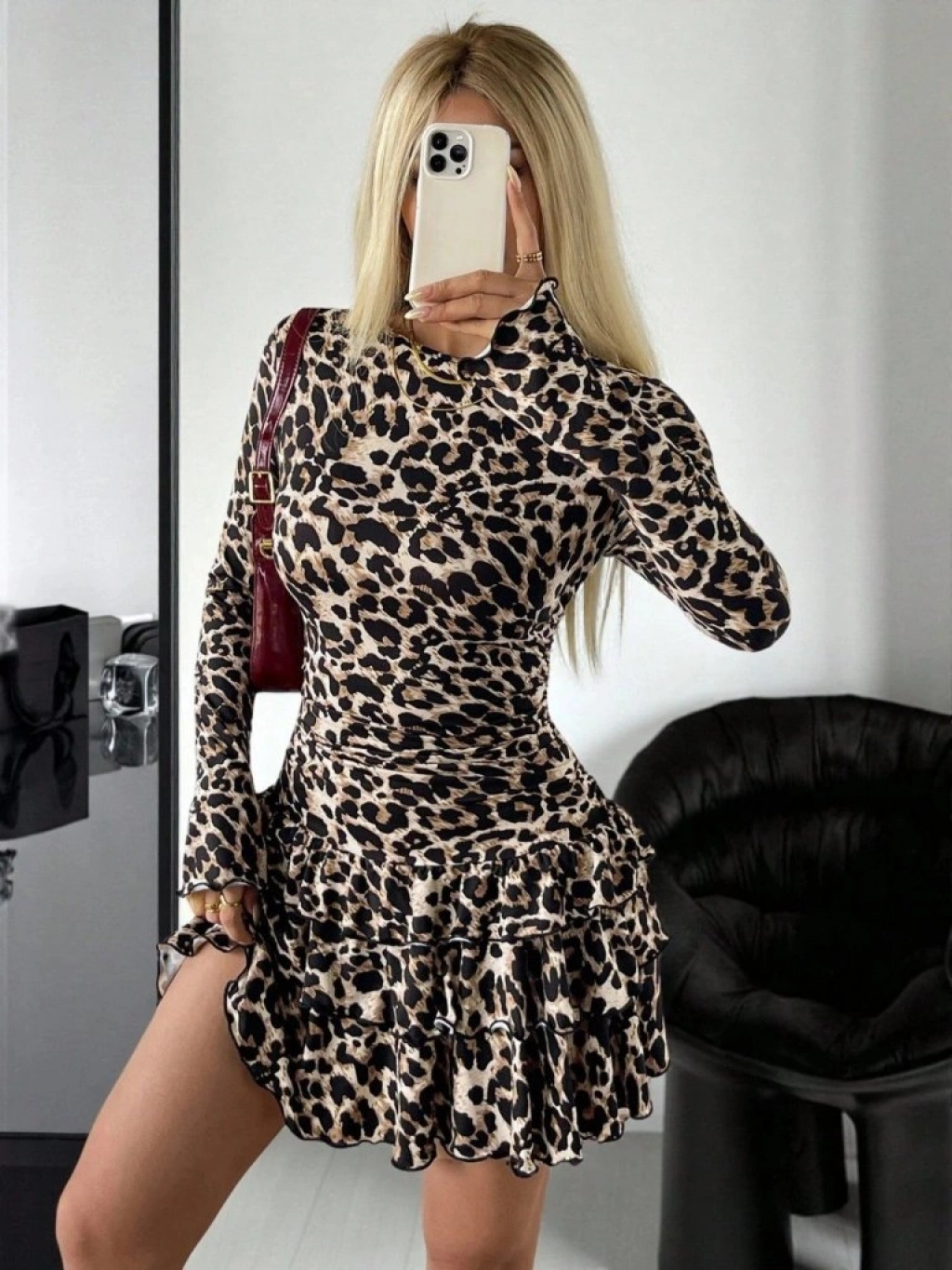 Kadın Uzun Kollu Balıkçı Yaka Fırfırlı Leopar Desenli Modal Elbise