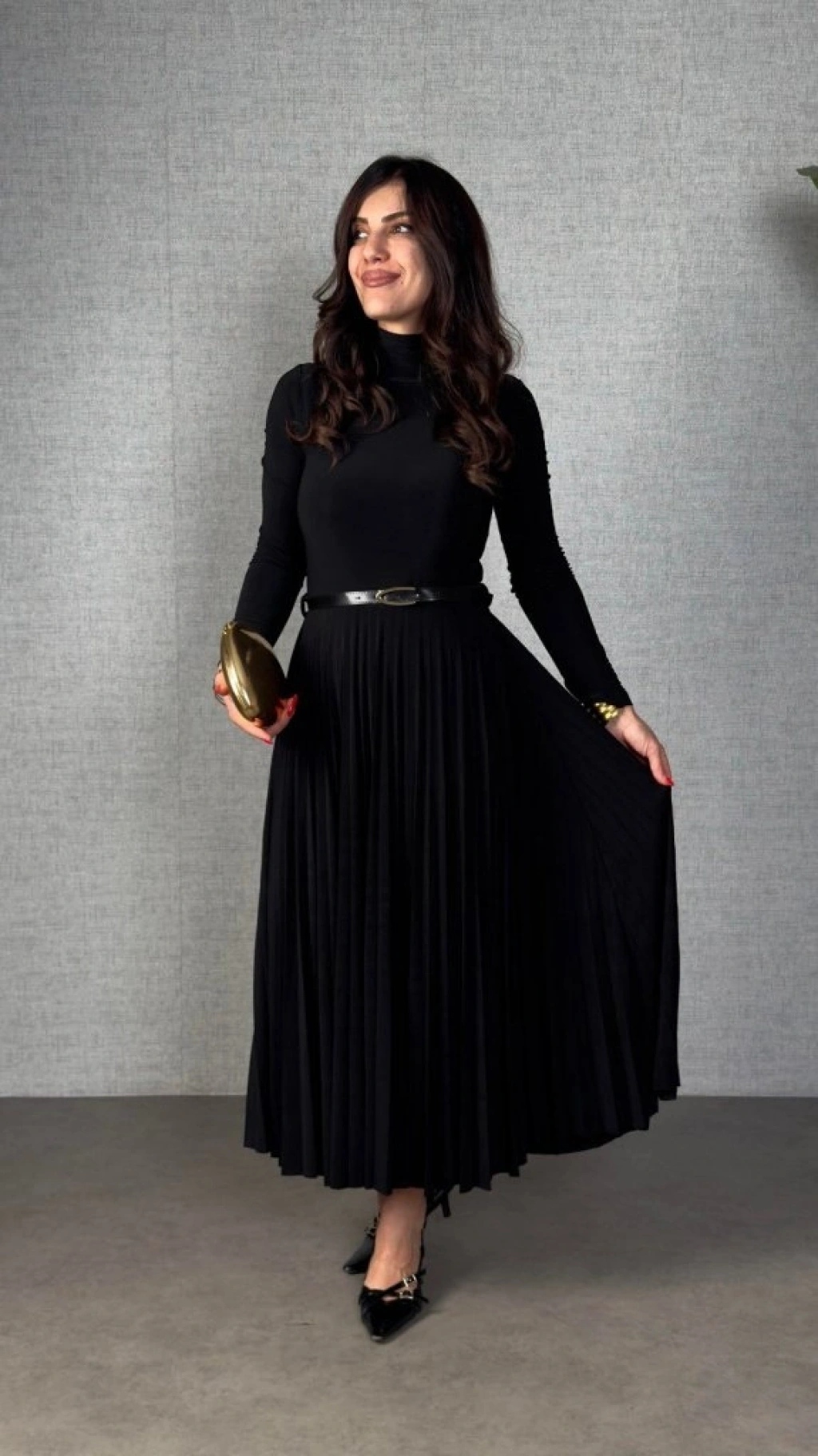 Kadın Uzun Kollu Balıkçı Yaka Kemersiz Pileli Uzun Sandy Elbise