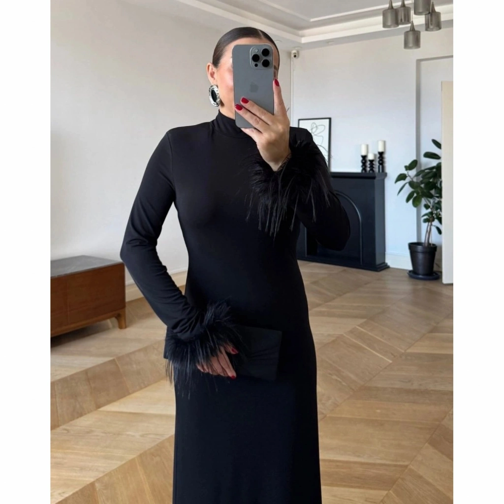 Kadın Uzun Kollu Balıkçı Yaka Kol Ağzı Tüy Detaylı Uzun Krep Elbise