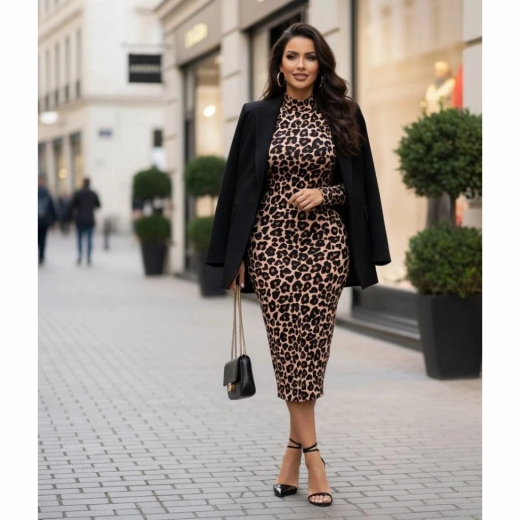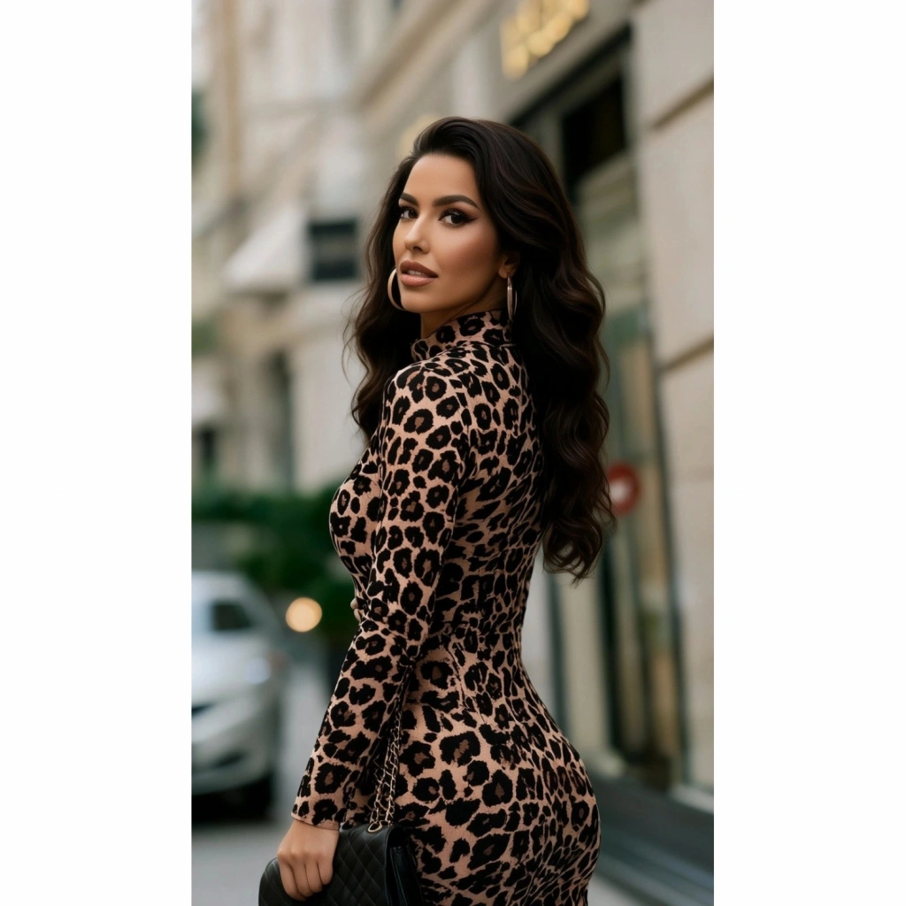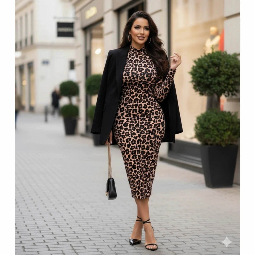 Kadın Uzun Kollu Balıkçı Yaka Leopar Desenli Midi Boy Elbise