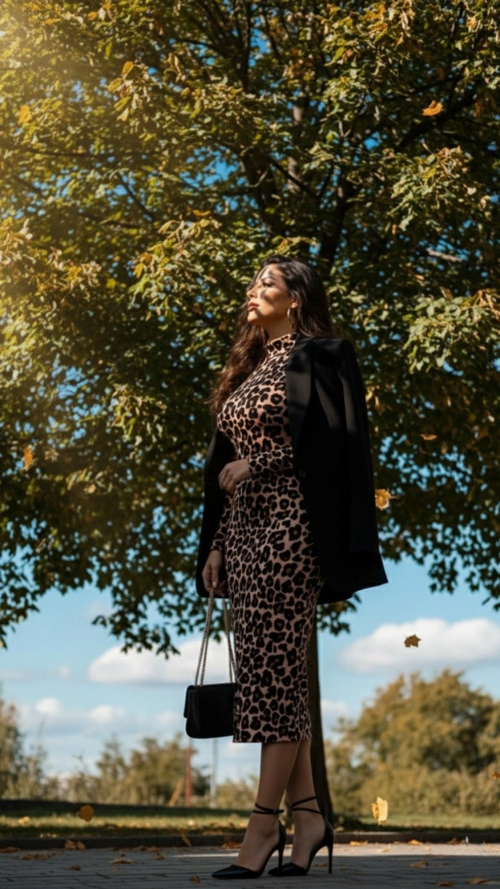 Kadın Uzun Kollu Balıkçı Yaka Leopar Desenli Midi Boy Elbise