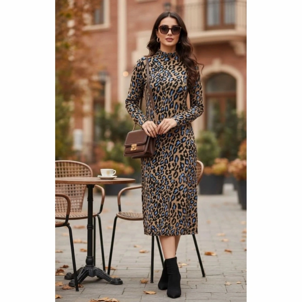 Kadın Uzun Kollu Balıkçı Yaka Leopar Desenli Midi Boy Elbise