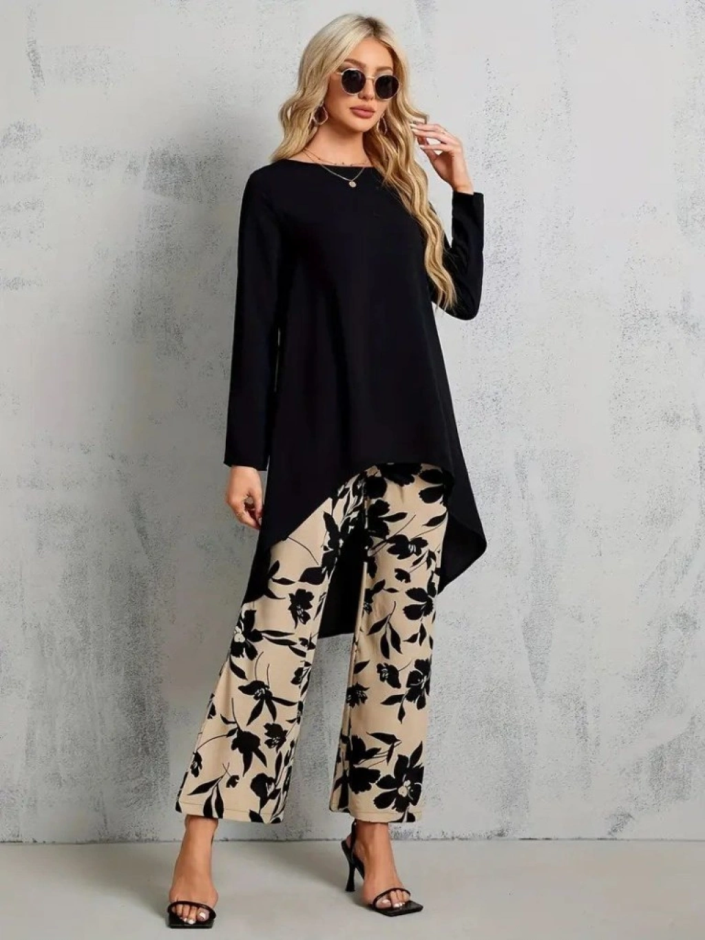 Kadın Uzun Kollu Bisiklet Yaka Asimetrik Kesim Detaylı Viskon Bluz Ve çiçek Desenli Iki Iplik Pantolon