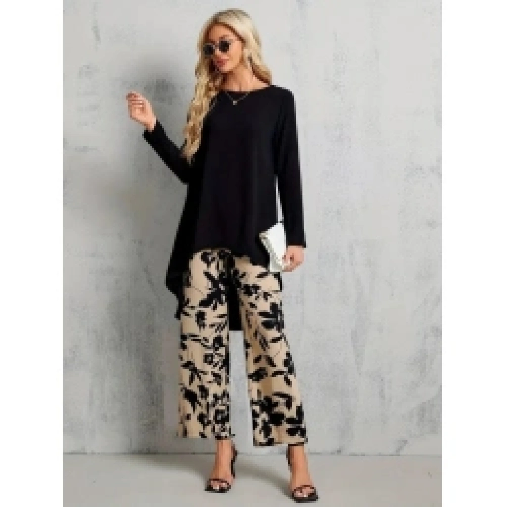 Kadın Uzun Kollu Bisiklet Yaka Asimetrik Kesim Detaylı Viskon Bluz Ve çiçek Desenli Iki Iplik Pantolon