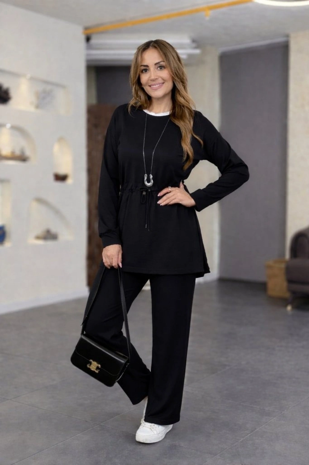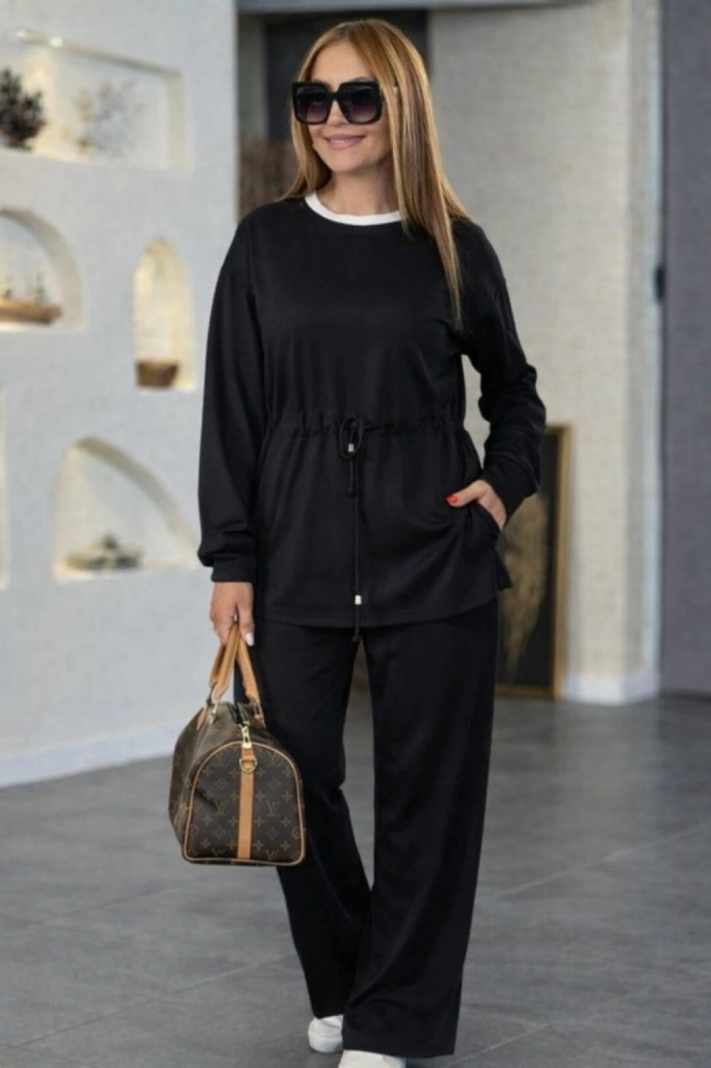 Kadın Uzun Kollu Bisiklet Yaka Belden Büzgülü Bağcıklı Viskon Iki Iplik Bluz Ve Pantolon Ikili Takım