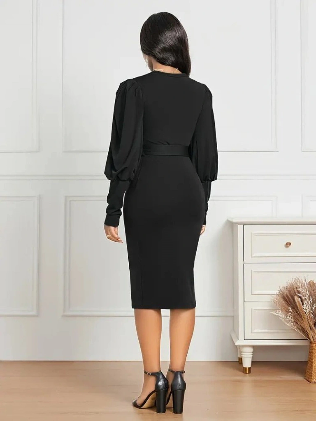 Kadın Uzun Kollu Bisiklet Yaka Beli Kuşaklı Ithal Krep Midi Elbise