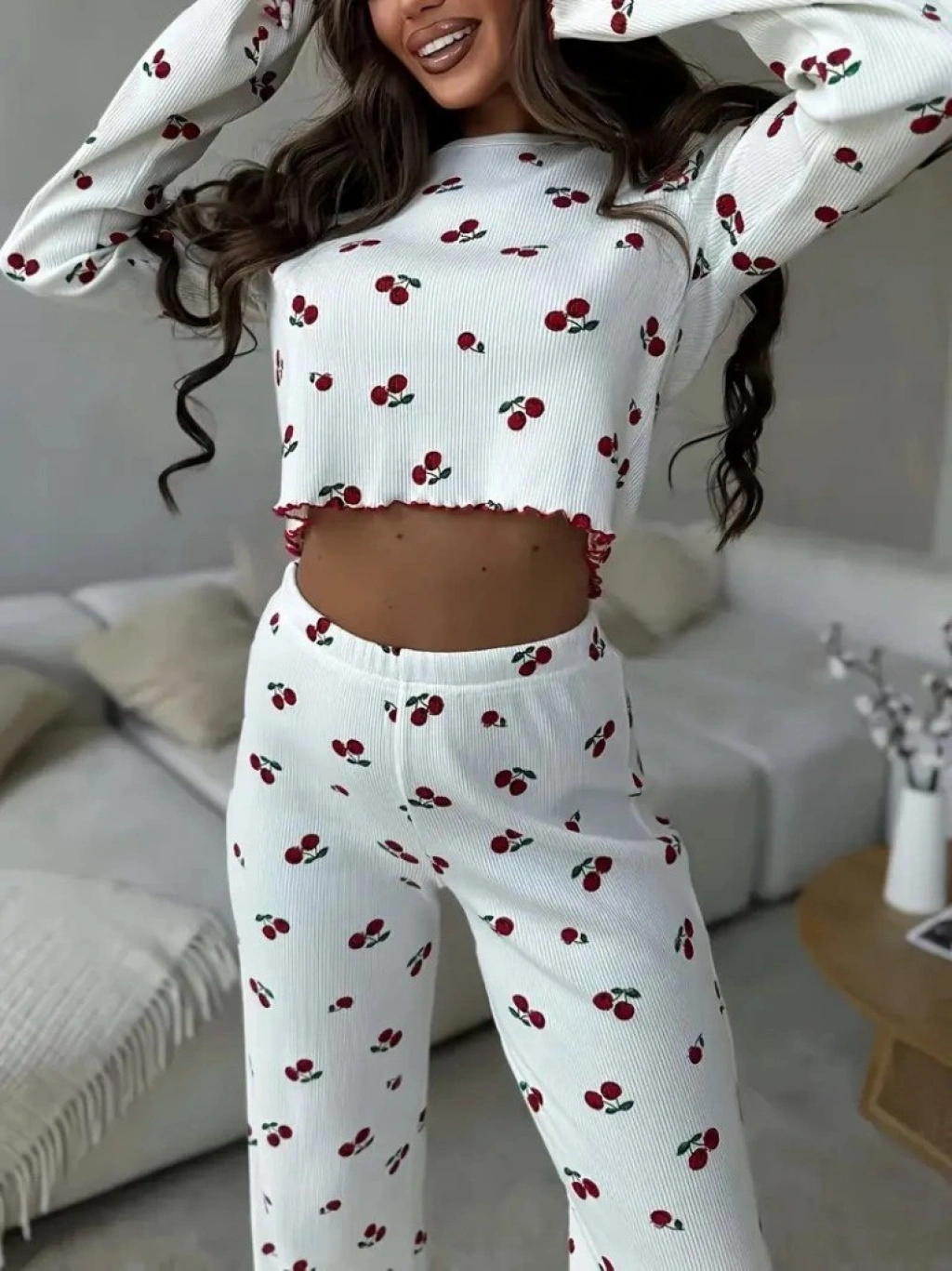 Kadın Uzun Kollu Bisiklet Yaka Desenli Burgu Bluz Ve Pijama Ikili Takım