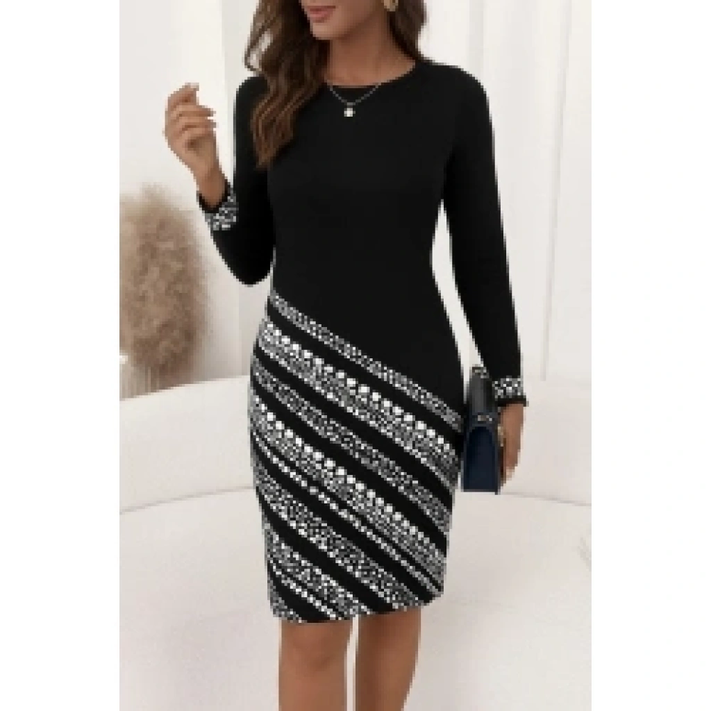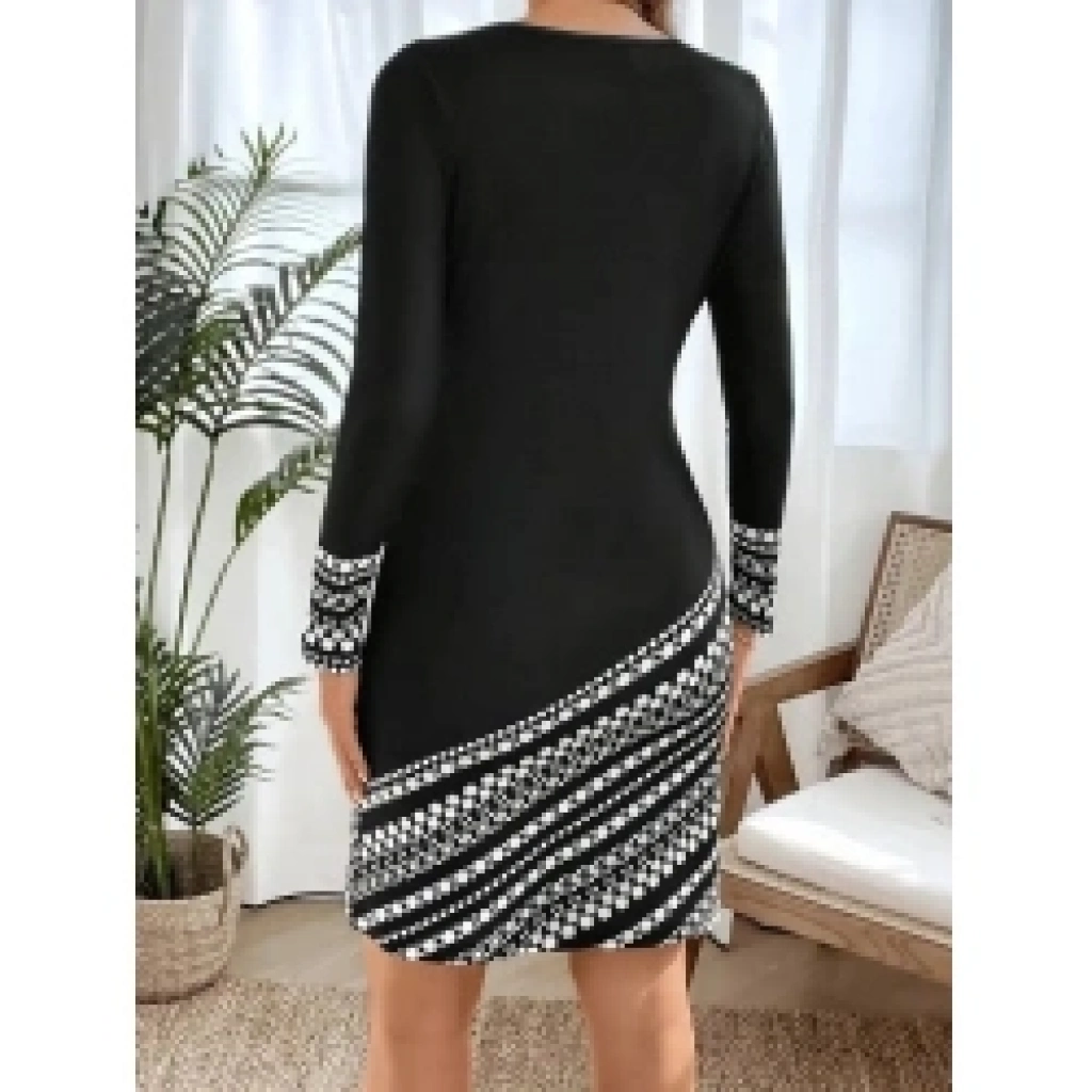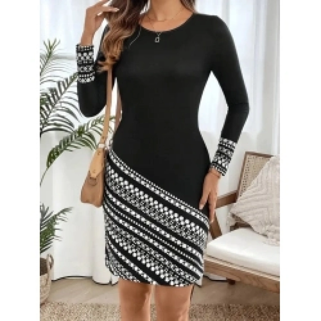 Kadın Uzun Kollu Bisiklet Yaka Desenli Dalgıç Elbise