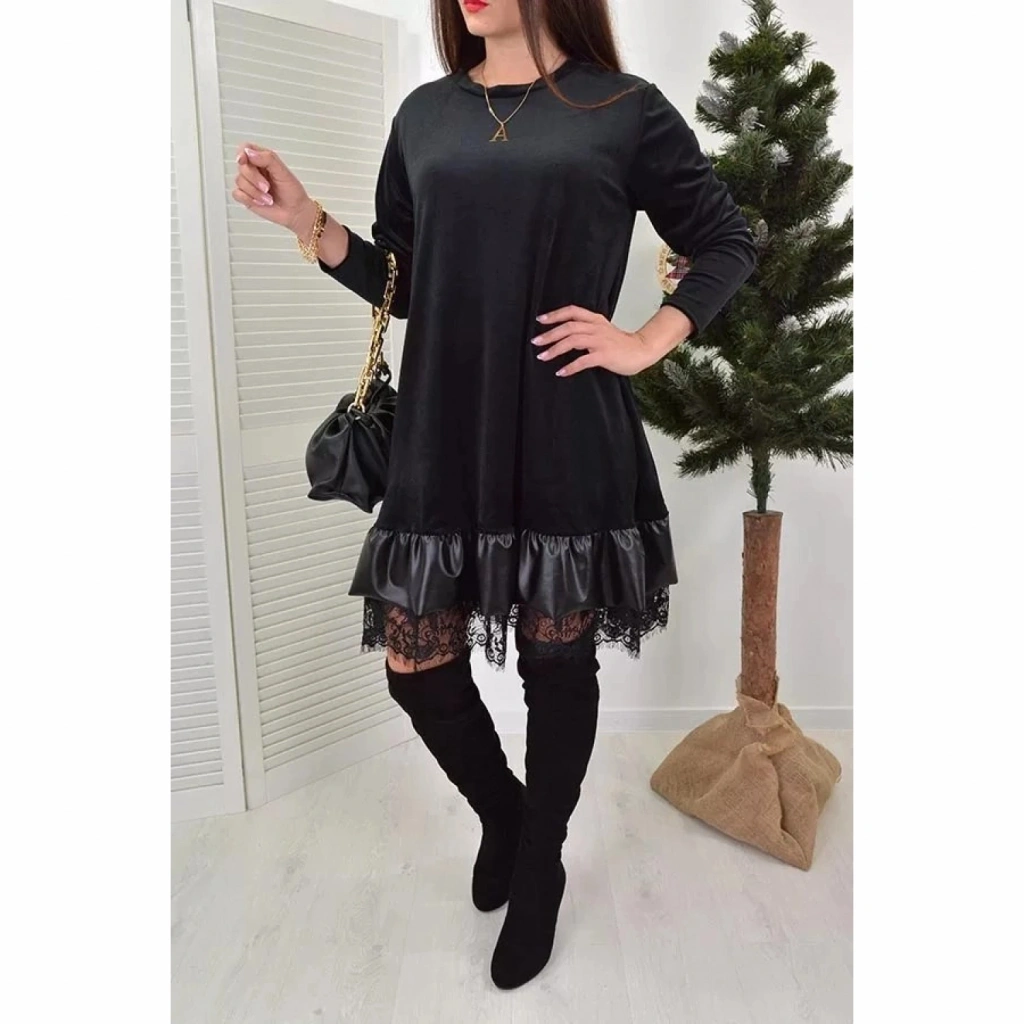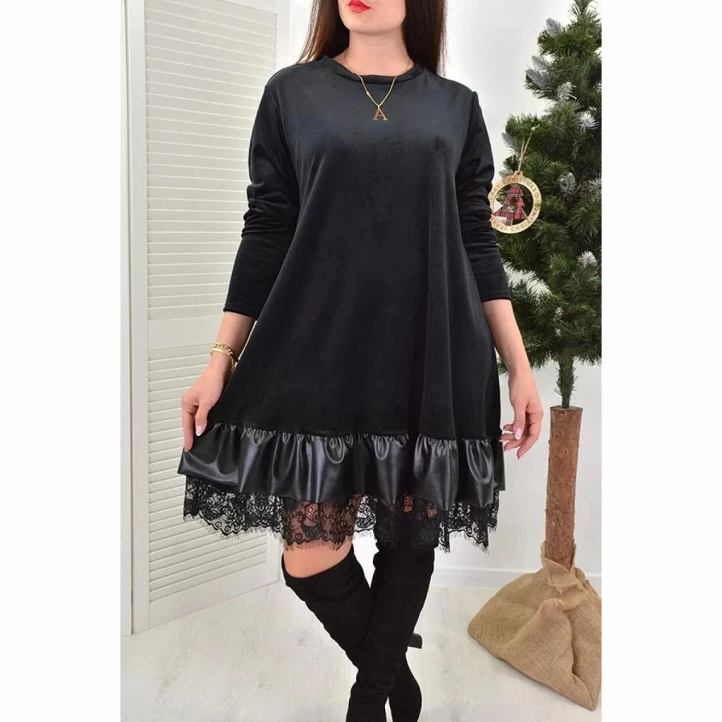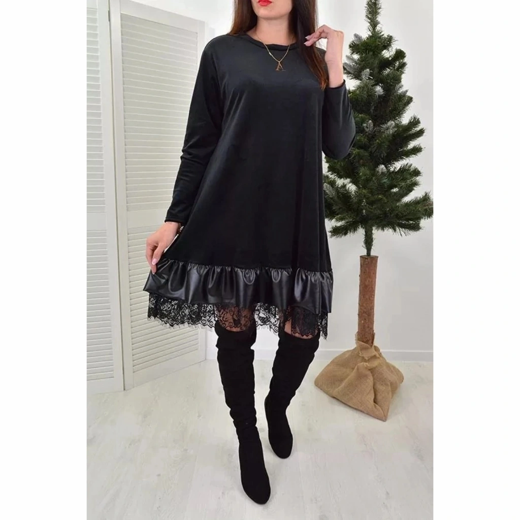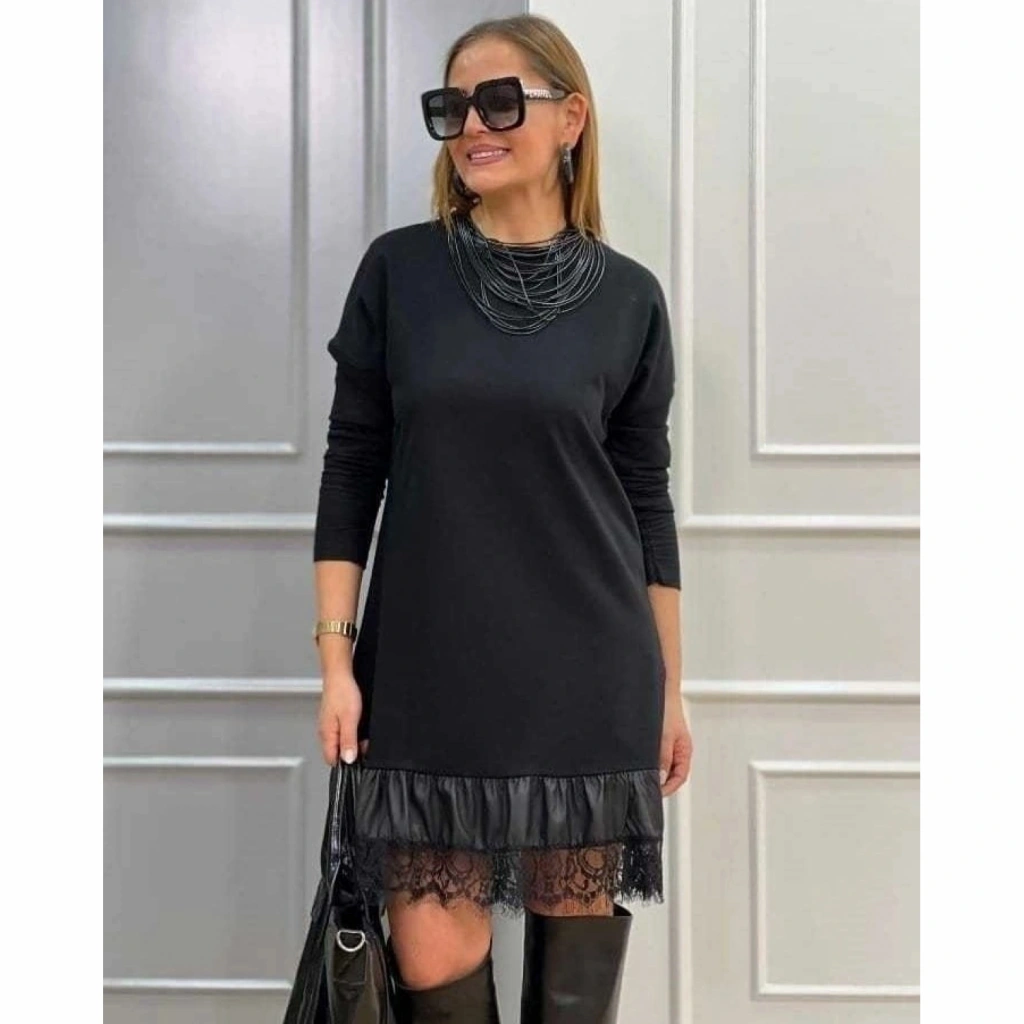 Kadın Uzun Kollu Bisiklet Yaka Etek Ucu Deri Ve Tül Detay Iki Iplik Mini Boy Elbise