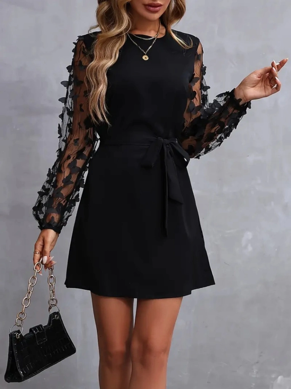 Kadın Uzun Kollu Bisiklet Yaka Kollar Tül Kelebek Detaylı Ithal Krep Elbise