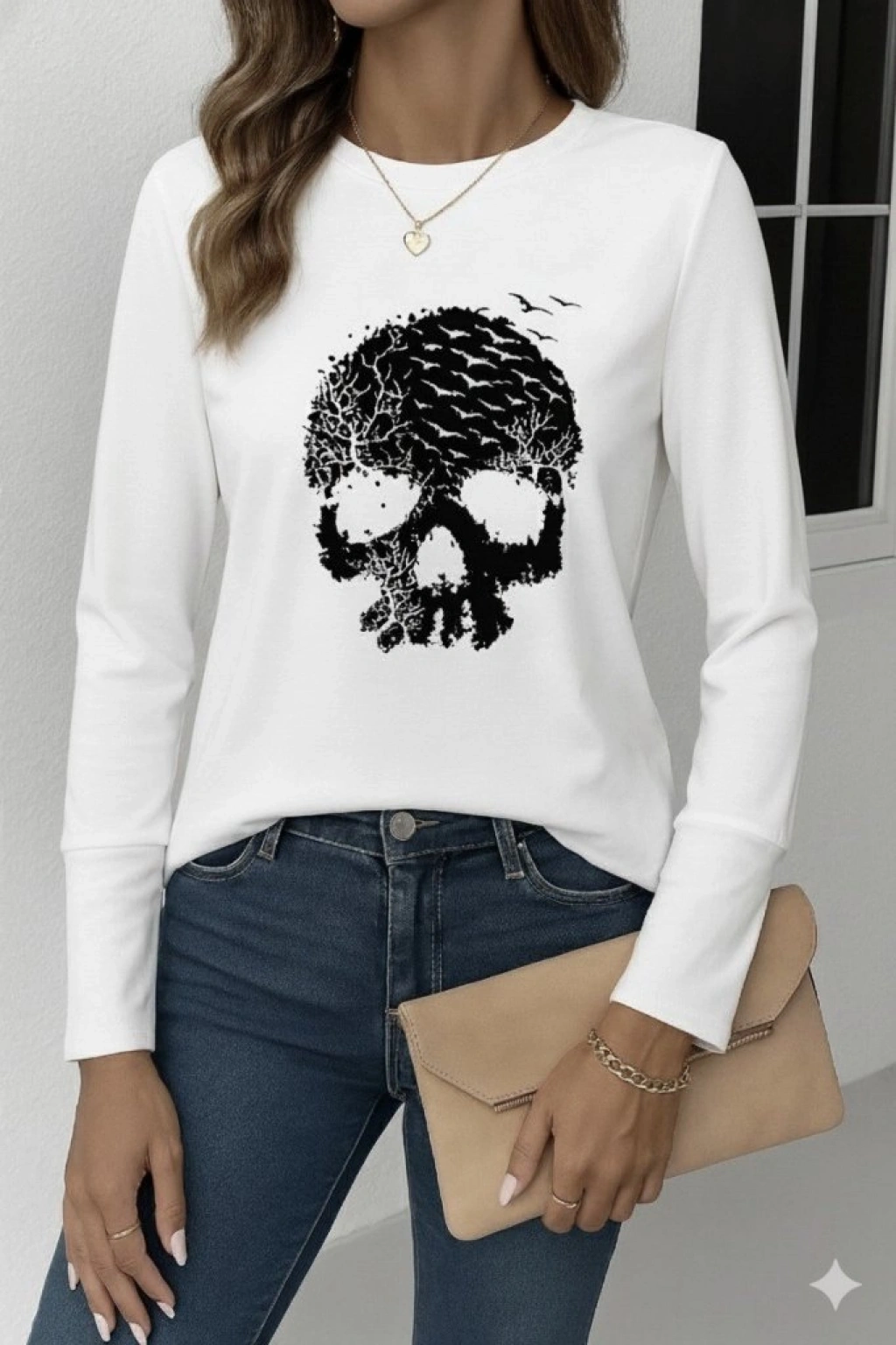 Kadın Uzun Kollu Bisiklet Yaka Kurukafa Desenli Viskon Bluz