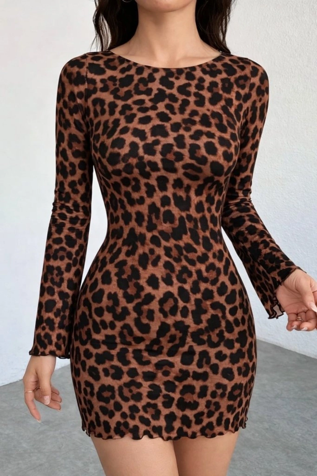 Kadın Uzun Kollu Bisiklet Yaka Leopar Desenli Dalgıç Mini Elbise