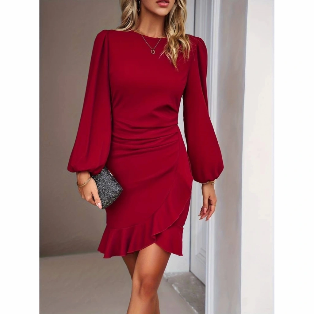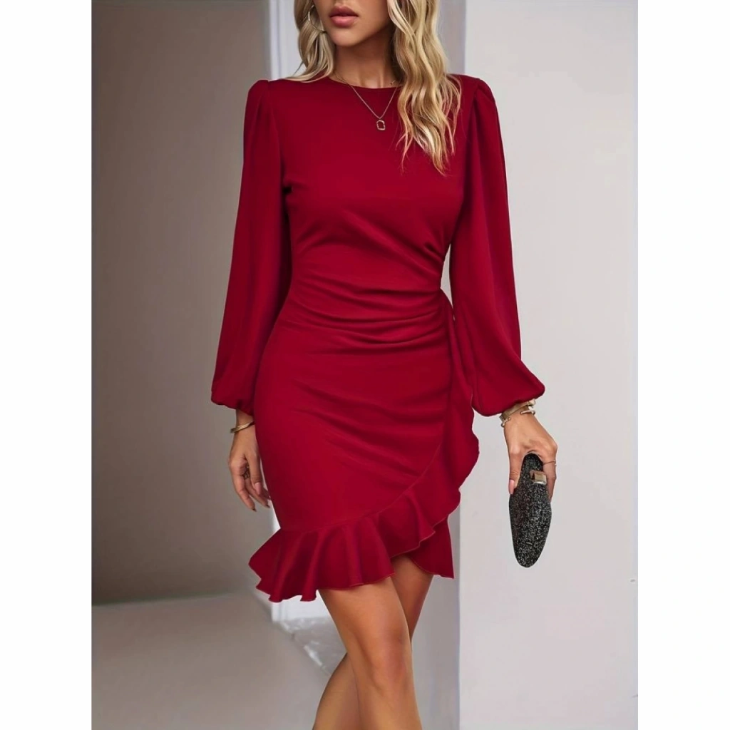 Kadın Uzun Kollu Bisiklet Yaka önden Volanlı Ithal Krep Elbise
