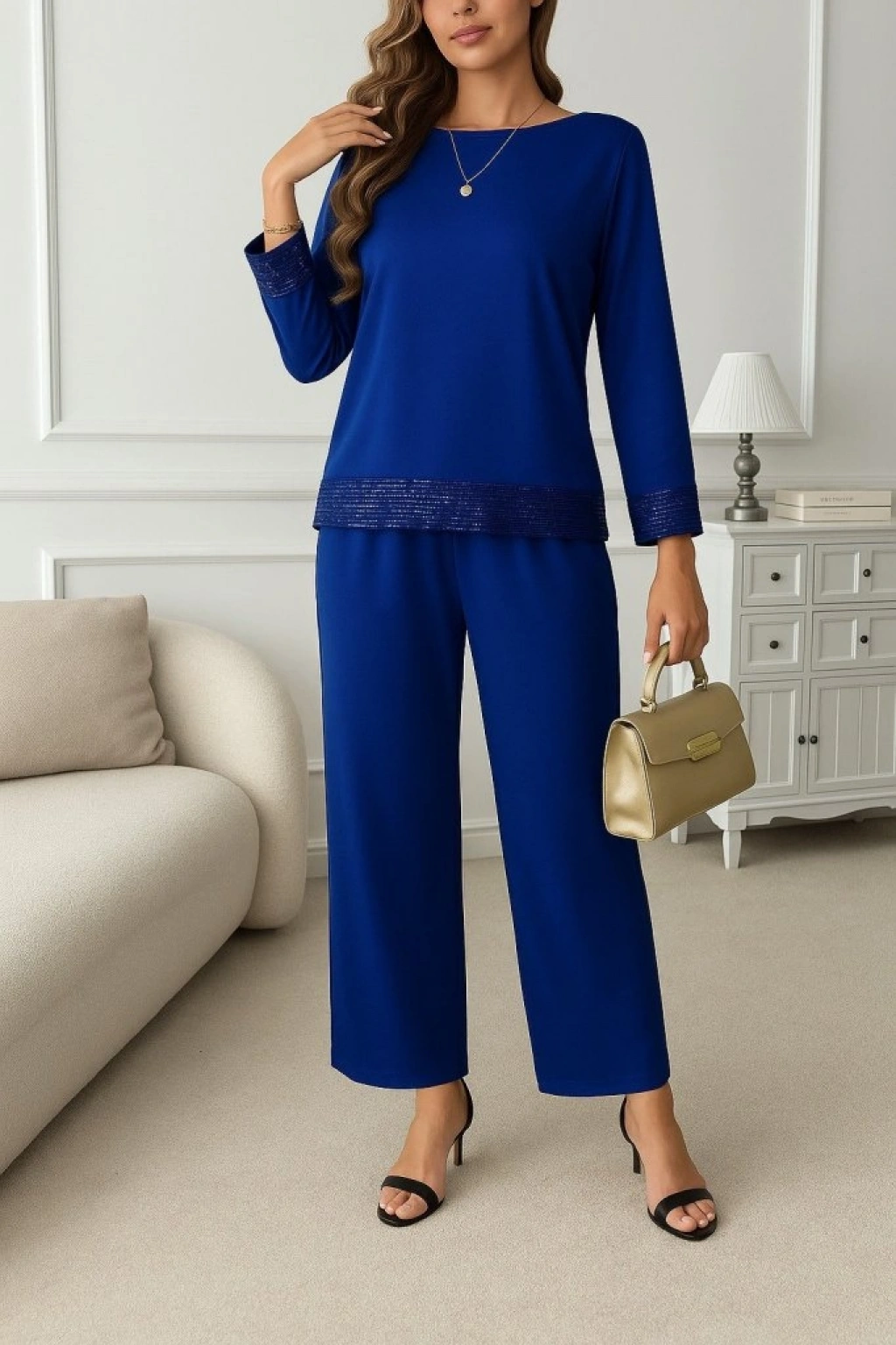 Kadın Uzun Kollu Bisiklet Yaka Pulpayetli Viskon Iki Iplik Bluz Ve Pantolon Ikili Takım