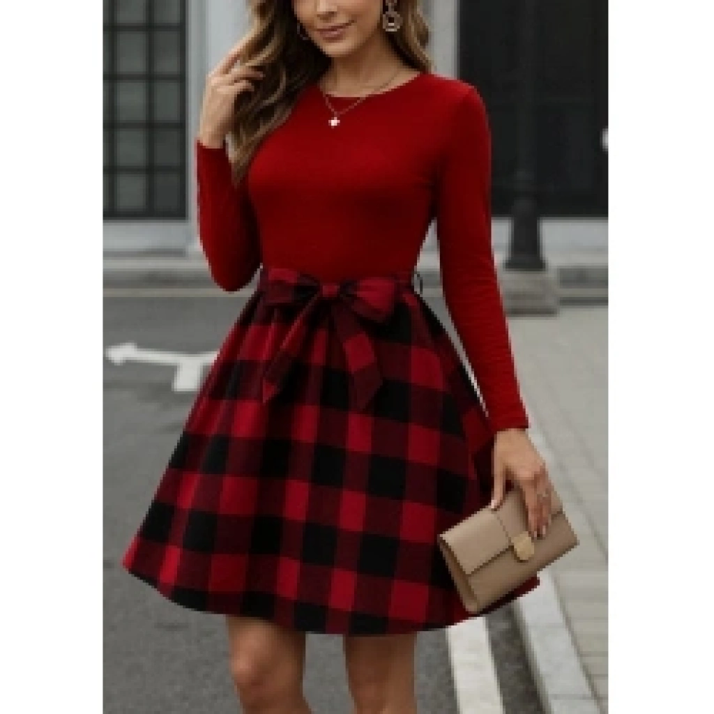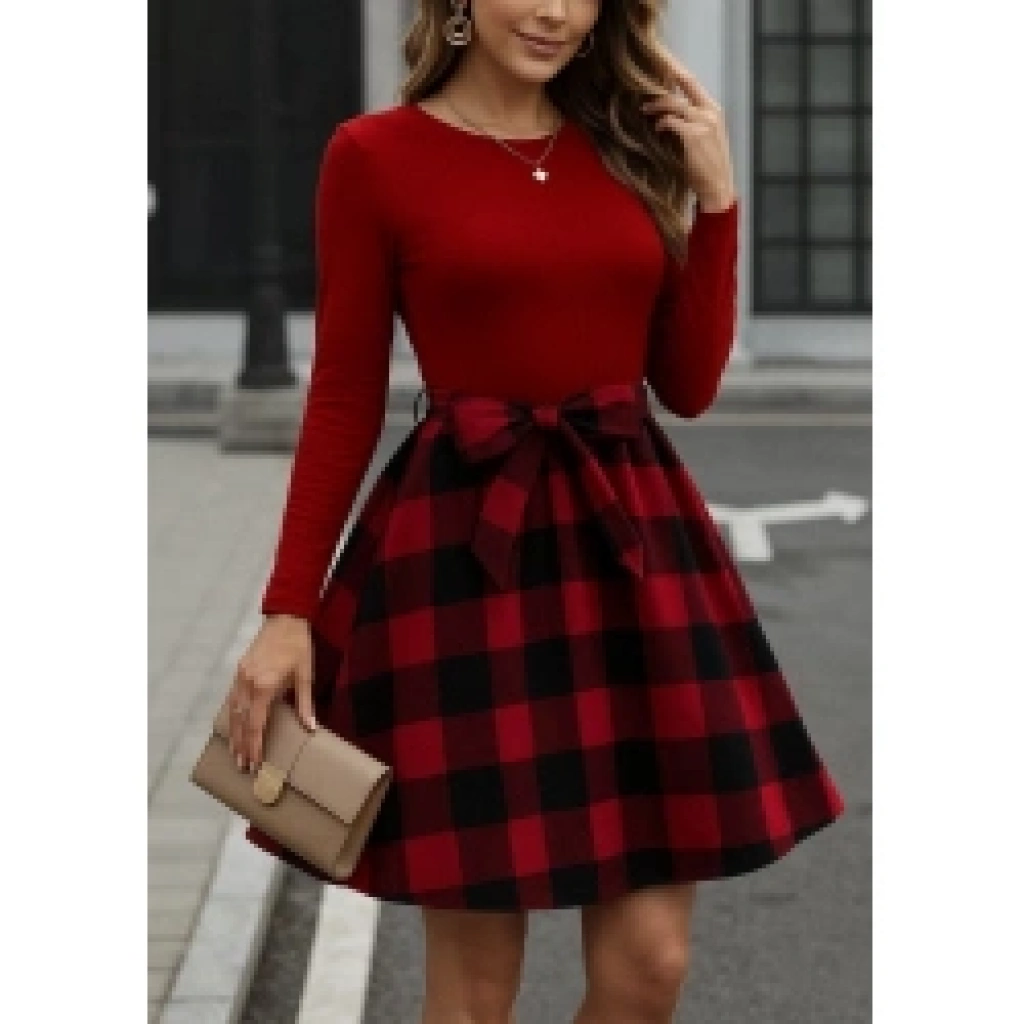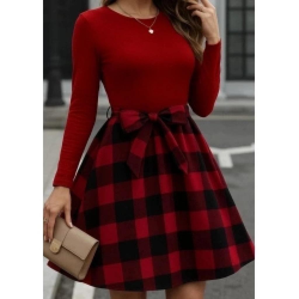 Kadın Uzun Kollu Bisiklet Yaka üst Viskon Alt Ekose Kısa Elbise