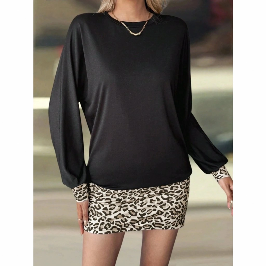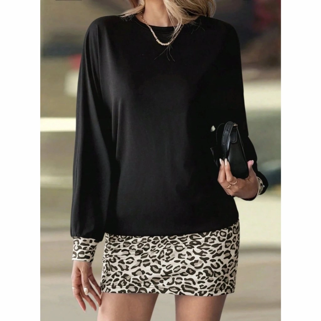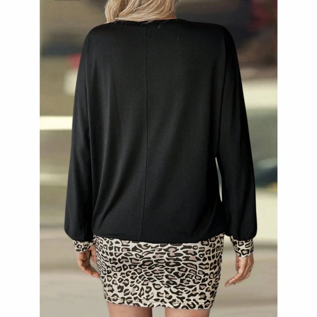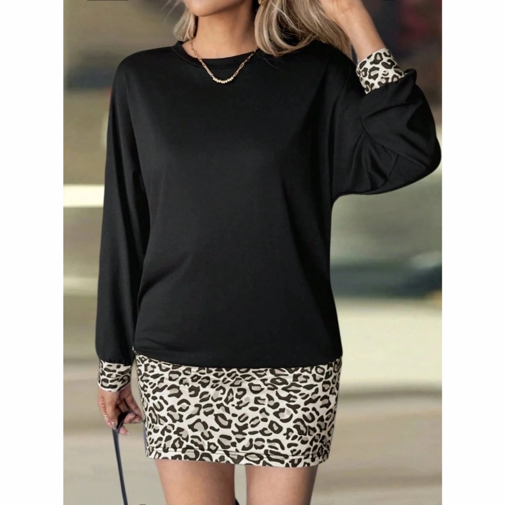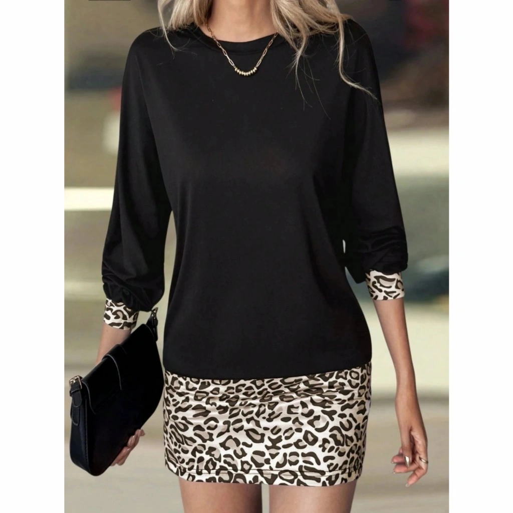 Kadın Uzun Kollu Bisiklet Yaka üst Viskon Iki Iplik Alt Leopar Desenli Mini Elbise