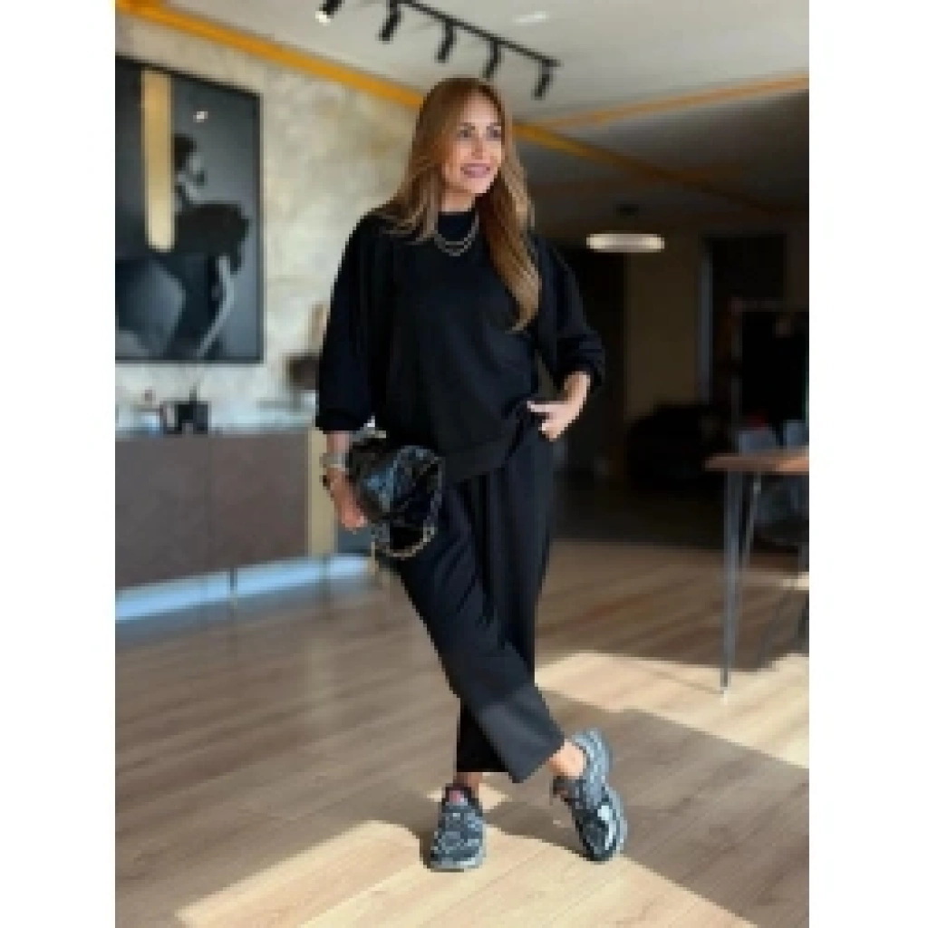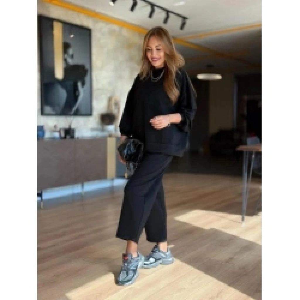 Kadın Uzun Kollu Bisiklet Yaka Viskon Iki Iplik Bluz Ve Pantolon Ikili Takım