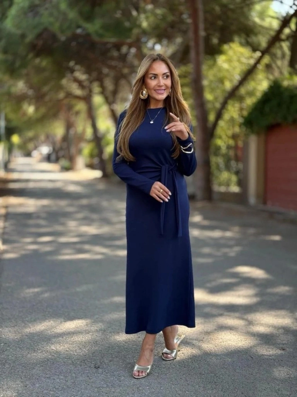 Kadın Uzun Kollu Bisiklet Yaka Yandan Bağlamalı Uzun Modal Elbise