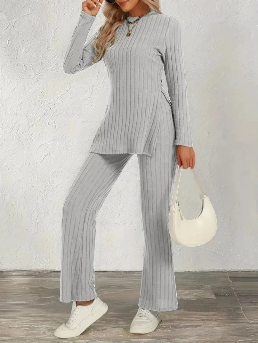 Kadın Uzun Kollu Bisiklet Yaka Yandan Yırtmaçlı şardonlu Kaşkorse Bluz Ve Pantolon Ikili Takım