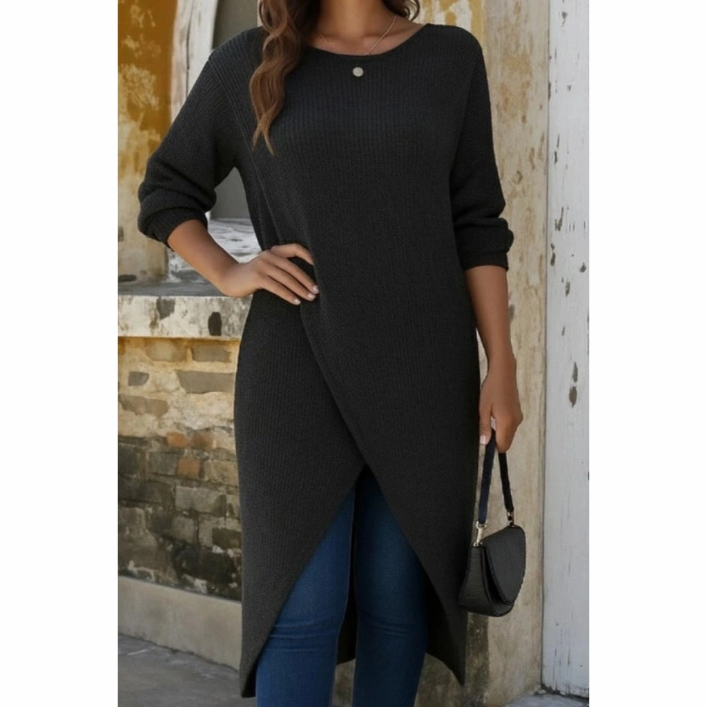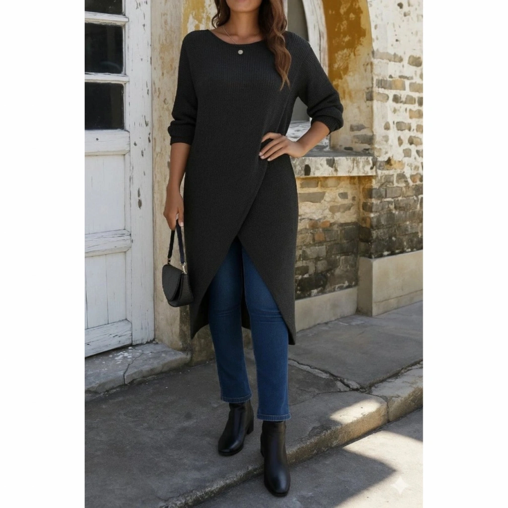 Kadın Uzun Kollu Bisiklet Yakalı önden çapraz Kesim Detaylı Midi Triko Elbise