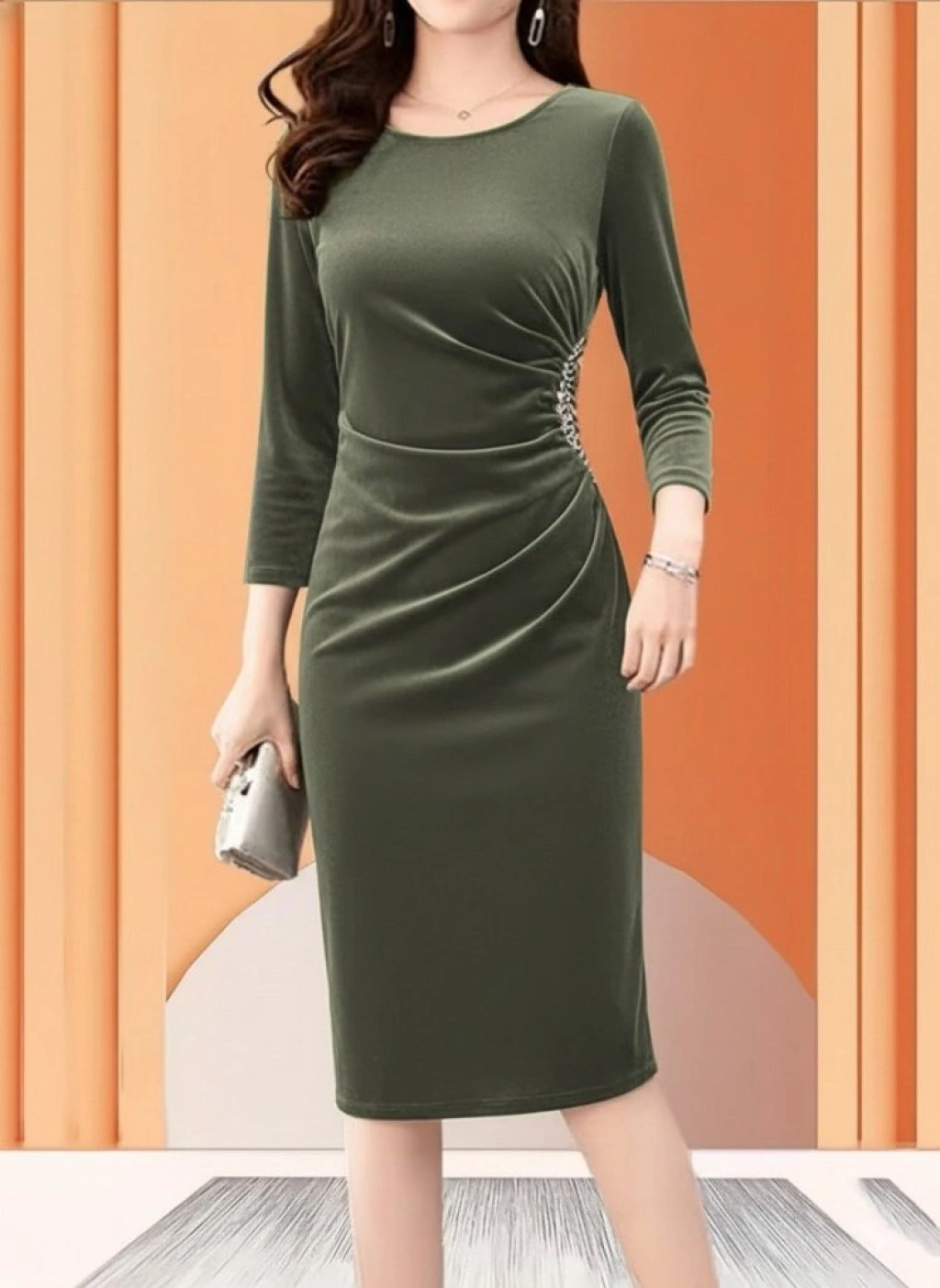 Kadın Uzun Kollu Bot Yaka Yanı Taş Detaylı Midi Kadife Elbise
