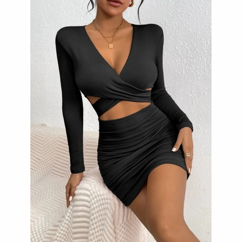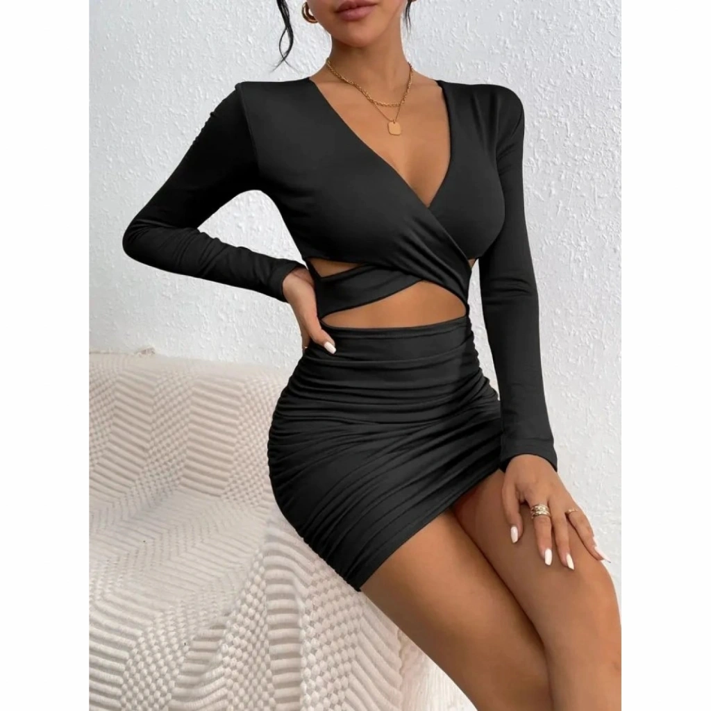 Kadın Uzun Kollu çapraz Dekolte Detaylı Mini Sandy Elbise