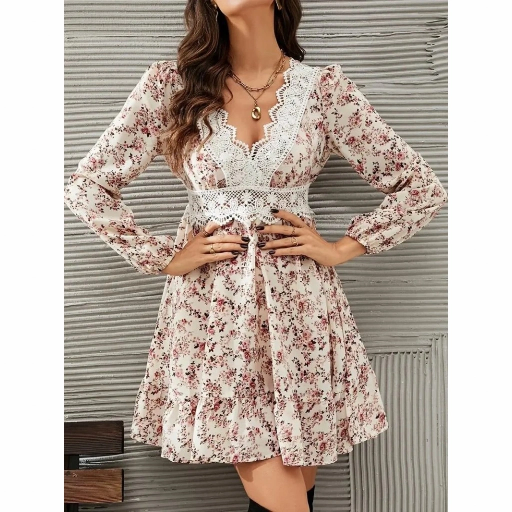 Kadın Uzun Kollu Dantel V Yakalı Mini Desenli Süprem Elbise
