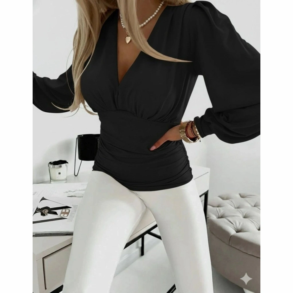 Kadın Uzun Kollu Derin V Yakalı önden Büzgülü Sandy Bluz
