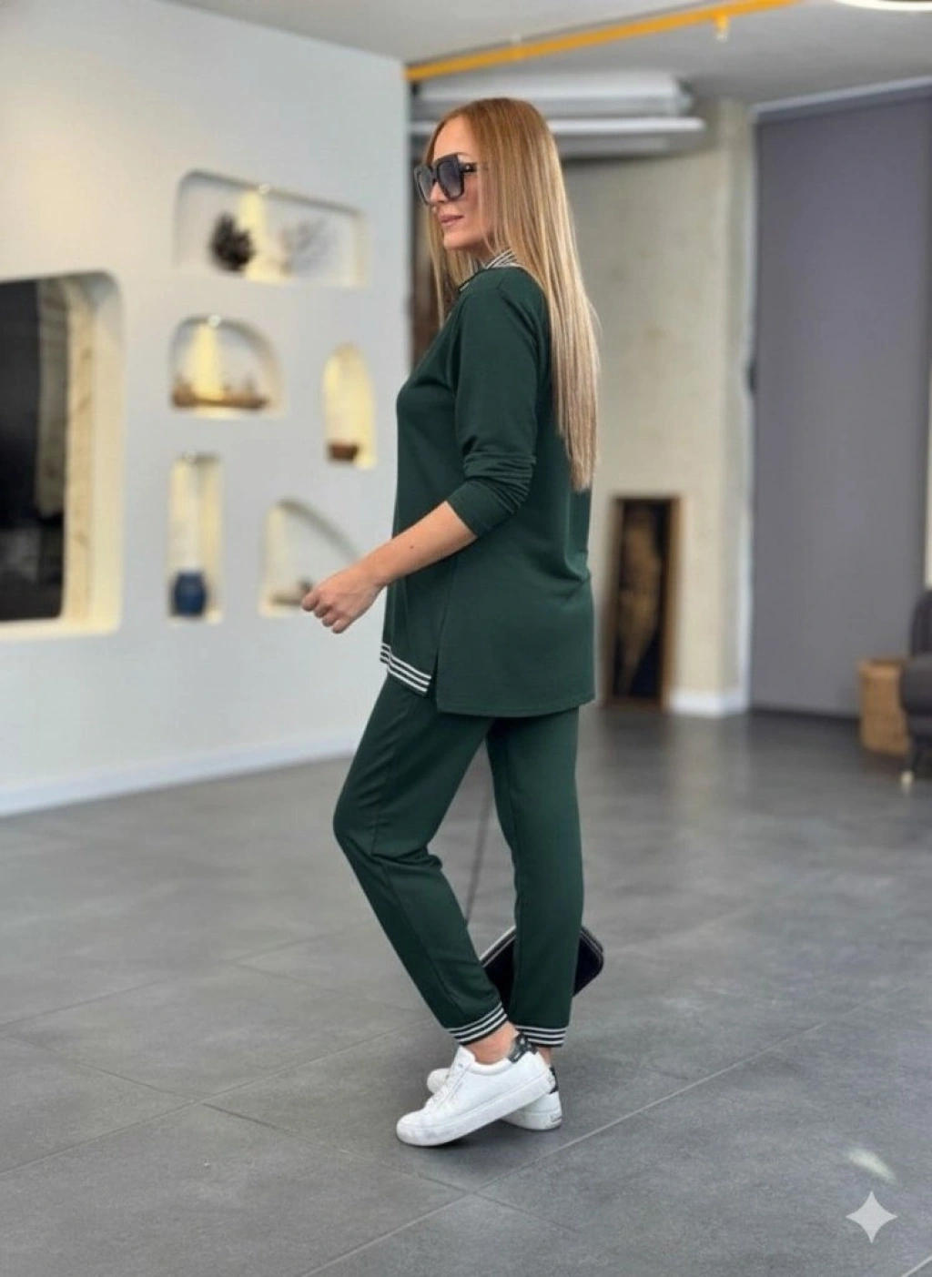Kadın Uzun Kollu Fermuarlı şerit Detay Desenli Alt üst Ikili Viskon Iki Iplik Takım
