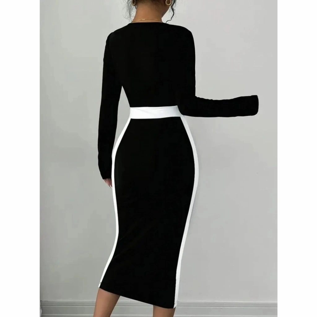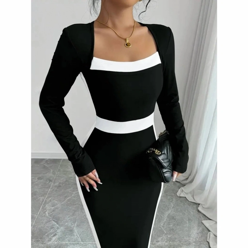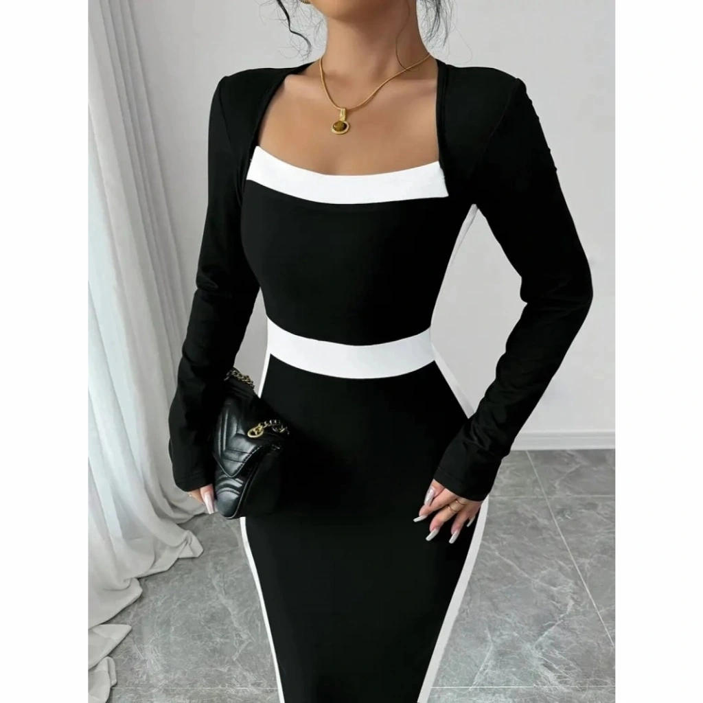 Kadın Uzun Kollu Geometrik Yaka Midi Ithal Krep Elbise