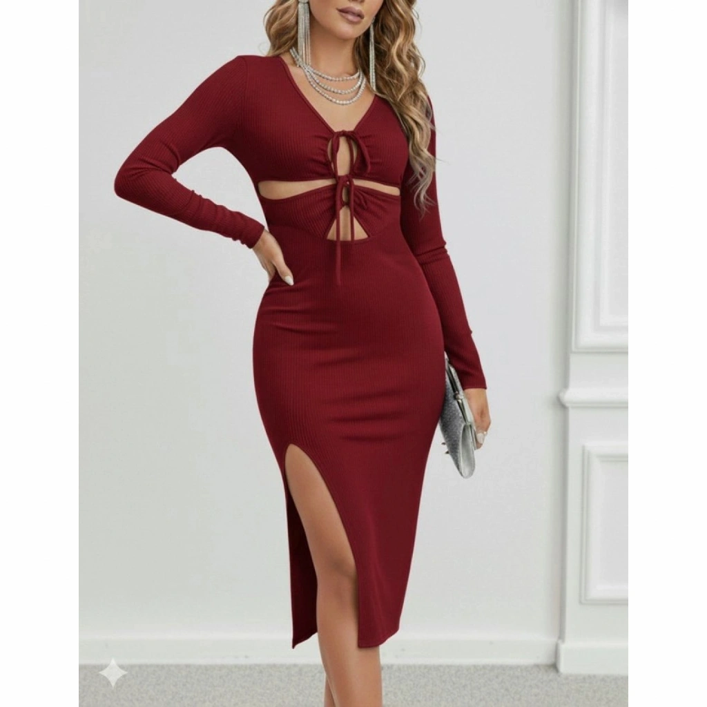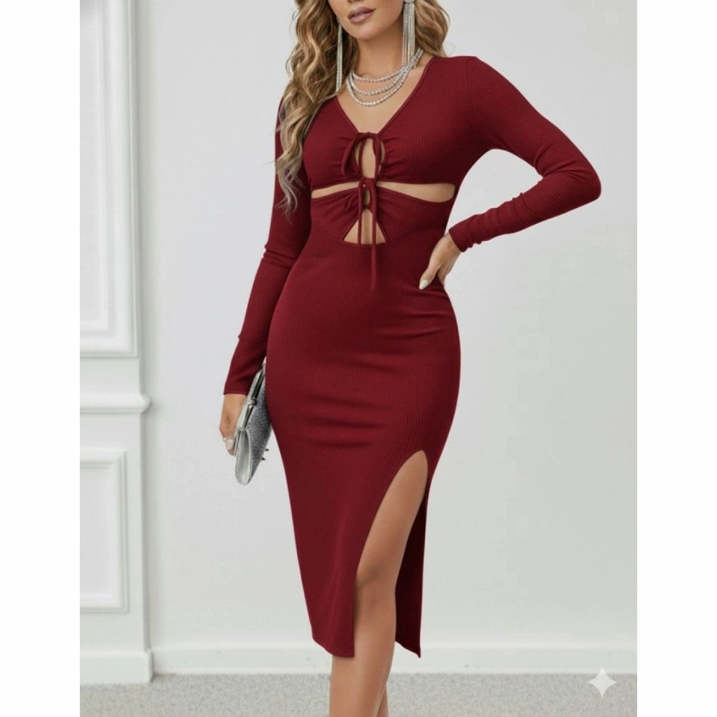 Kadın Uzun Kollu Göğüs Ve Göbek Dekolte Detay Sandy Midi Boy Elbise