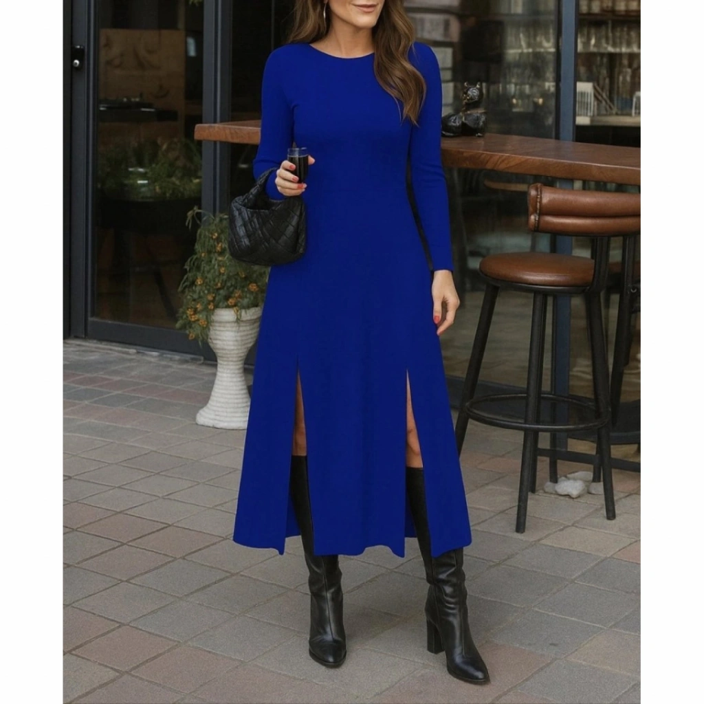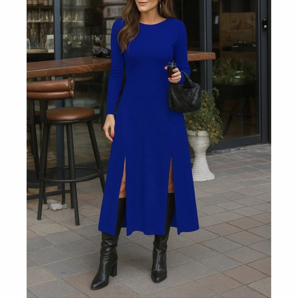 Kadın Uzun Kollu Hafif Kayık Yaka Sırt Dekolteli Yırtmaç Detaylı Viskon Tam Boy Elbise