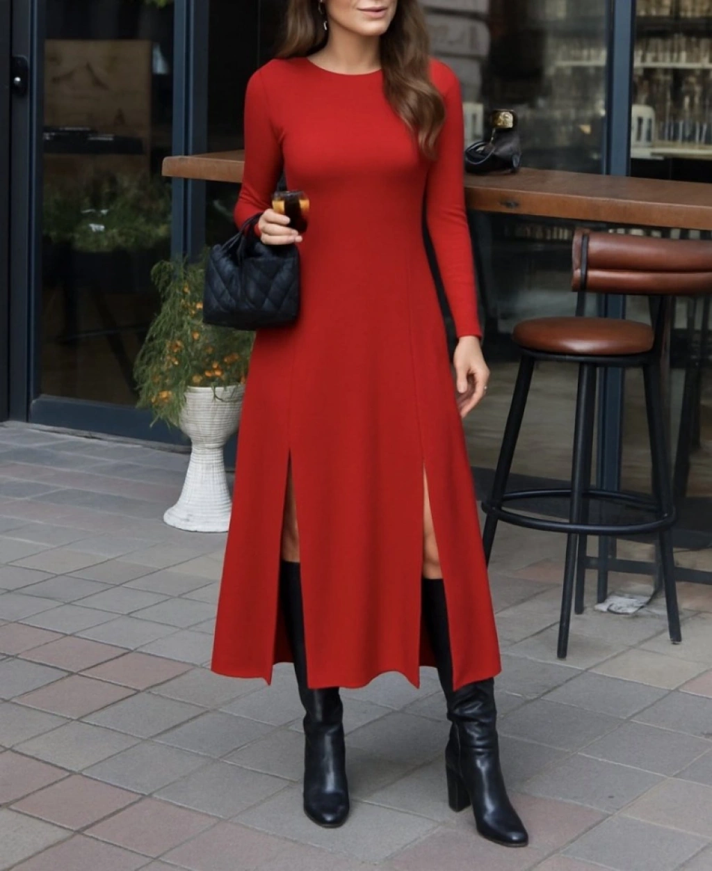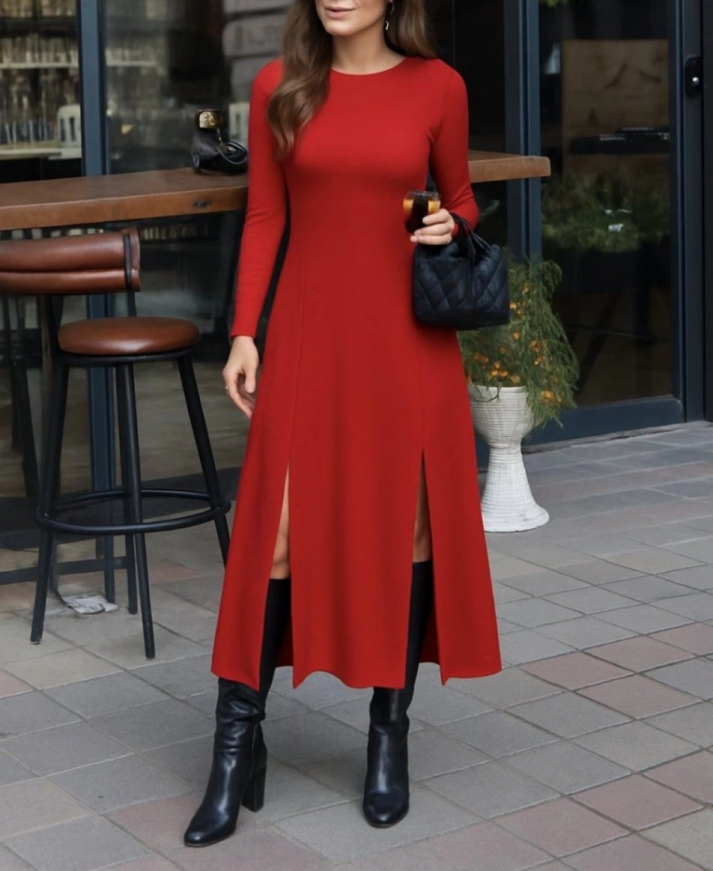 Kadın Uzun Kollu Hafif Kayık Yaka Sırt Dekolteli Yırtmaç Detaylı Viskon Tam Boy Elbise