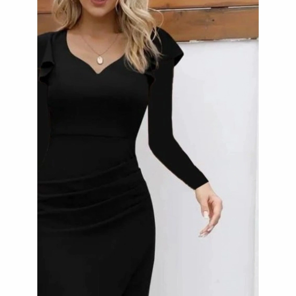 Kadın Uzun Kollu Kalp Yaka önden çapraz Detaylı Midi Ithal Krep Elbise